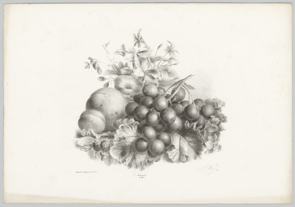 Curator: At first glance, this drawing whispers of simple abundance. Editor: Indeed. What we have before us is “Druiven, perziken en hazelnoten,” or “Grapes, Peaches, and Hazelnuts” in English. The Rijksmuseum holds this exquisite example of still life created with graphite, pencil, and colored pencil sometime between 1820 and 1833. Curator: The stark simplicity strikes me immediately; a muted color palette lends a sense of quiet introspection. Look at how the textures vary across surfaces - the bloom on the grapes versus the downy fuzz of the peaches, a testament to technical skill! Editor: Certainly. One must remember that the cultural appetite for such realistic depictions, particularly of domestic still lifes, reflects the values of the rising bourgeois class. Owning and displaying detailed representations of worldly goods served a critical socio-political function for those looking to legitimize their power and cultural worthiness. Curator: It is also a wonderful example of naturalism. Consider the composition, though seemingly casual, each piece of fruit is arranged to lead the eye through. The tonal variation helps the fruits seem almost tactile; one could reach out and pluck them. Editor: Precisely. And the drawing underscores how, within the social institutions of art like museums, realism comes to signify not merely an aesthetic style, but a tool that, deliberately or not, mirrors and reinforces specific social frameworks and their attendant power structures. Think, for instance, of the changing perceptions and valuation of still life across centuries and in relation to gender dynamics... Curator: Interesting considerations. Yet the drawing continues to reveal subtlety at every angle! One could ponder about social implications and, yet, still get drawn back to pure artistic mastery! Editor: Absolutely. It offers multiple portals for consideration. Whether contemplating socio-political frameworks or exploring formal nuances.