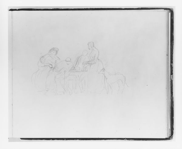 Curator: This drawing by Francis William Edmonds, likely from sometime between 1834 and 1838, titled "Two Men on a Workbench with a Vice," captures a seemingly mundane scene, rendered delicately in pencil. It is part of a sketchbook currently held at the Metropolitan Museum of Art. Editor: My first thought? A sort of quiet resignation permeates the scene. The muted tones and almost imperceptible rendering of labor hint at a world weary of relentless demands. The slouch of the seated man, the other hunched at the vice, a powerful contrast. Curator: It's interesting you say that, because, looking at this as a materialist, I'm immediately drawn to the workbench itself and the vice. The workbench clearly functions as the site where labor occurs. Think of all the other works the artist must have studied to arrive at such accuracy. The choice to emphasize these objects positions the drawing within a larger dialogue about craft and industry during the 19th century. Editor: Precisely! This isn’t just about observation. Edmonds captures men at the intersection of labor, class, and a nascent American identity. I see themes of social hierarchy reflected in their poses and relative placement; it begs questions about what work they were involved in, who owned the means of their production. We might consider their lack of agency, given the vice grip upon them metaphorically. Curator: I’m curious about the actual making process. Given it's a pencil sketch, a readily available, affordable material, does that perhaps comment on the democratizing potential of art, even as it depicts laborers seemingly caught in a cycle of work? Did the artist attempt to democratize fine art practices? Editor: Possibly, yes, a step toward accessibility—but one framed within the social realities of the time. The “romanticism” style indicated in the metadata could mean these men were presented to solicit feelings of sympathy, if not outright pity, from Edmonds' intended audience, highlighting the distance between the viewer and the working class subject. This is, like so much art from the time, tied inextricably to the issue of spectatorship. Curator: Viewing Edmonds' process in terms of materials and social class complicates notions of Romanticism that may traditionally emphasize escape and fantasy, pushing it into social commentary instead. I appreciate how analyzing the method offers deeper understanding, while simultaneously connecting to the narrative's larger context, providing a different kind of accessibility. Editor: Absolutely, and in engaging with these narratives we invite present viewers into relevant discourses around issues like labor, inequality, and power. Thank you for unpacking this intriguing glimpse into history!