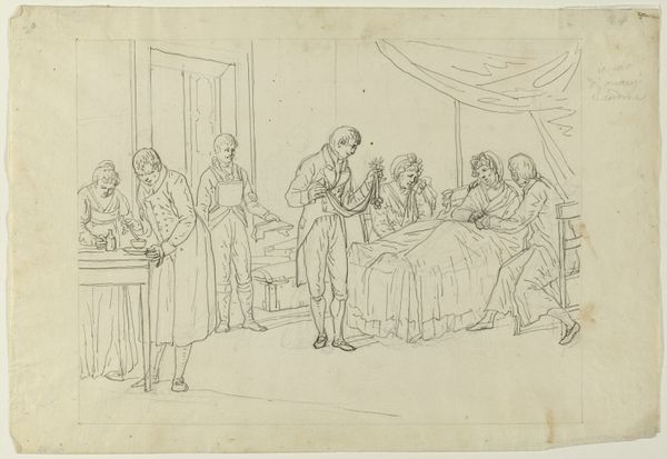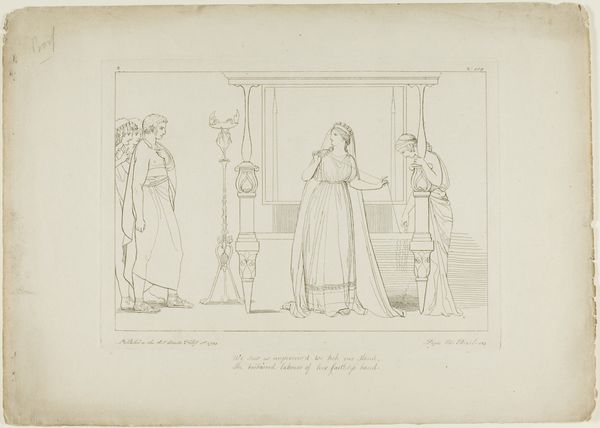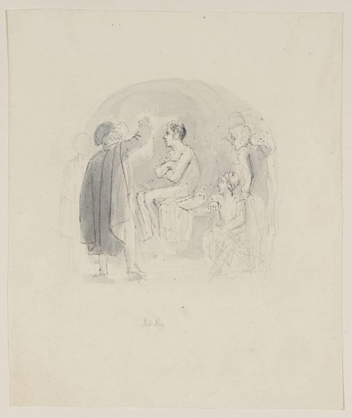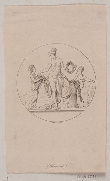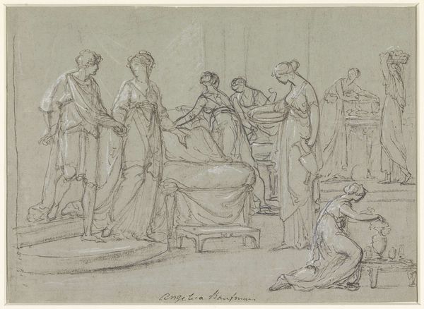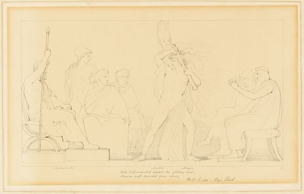 John Flaxman created "Vulcan and Thetis" with pen and brown ink. The drawing presents a study in classical form and emotional restraint, dominated by precise lines and a muted color palette. It evokes a sense of solemnity and introspection. The composition, divided into distinct groupings, underscores a narrative of divine appeal and craftsmanship. On the left, Thetis is seated, rendered with delicate lines that emphasize her sorrowful posture. The lines define form and convey emotional weight. To the right, Vulcan is depicted with a controlled strength. This contrast highlights the power dynamics. Flaxman's approach reflects the Neoclassical ideals of order and clarity. The linear precision and stark composition serve to distill the narrative to its essential elements, inviting contemplation on themes of divine intervention and human emotion.