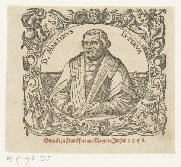 This is a portrait of an unknown man made in an engraving by an anonymous artist. The subject is framed within a circle teeming with cherubic figures and grotesque masks, creating a visual tension between the classical and the uncanny. Observe how the circular composition serves not only to isolate but also to elevate the sitter, drawing immediate attention to his steady gaze. The detailed cross-hatching technique gives volume to his garments and face. The arrangement of figures around the perimeter isn't merely ornamental; it is a structural device that both contains and contrasts the stillness of the central figure. The juxtaposition of sacred and profane imagery suggests a deeper exploration of human nature. Here, the rigid framework of the portrait challenges fixed meanings. The work functions as a site where aesthetic beauty and philosophical inquiry meet, inviting ongoing interpretation and re-interpretation.