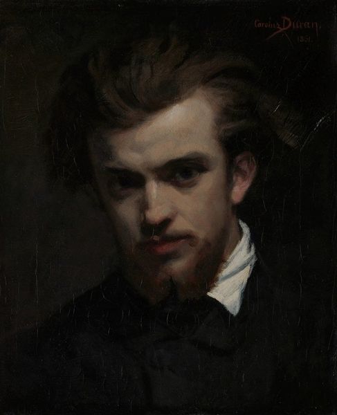Jean-Joseph-Benjamin Constant created this oil on canvas, *Portrait De Jeune Homme Barbu Dit L'albinos*, in the late 19th century. The somber palette and tight composition draw our attention to the sitter's unusual pallor, which starkly contrasts with the darkness. Constant employs a classical portrait format but disrupts it through his interest in texture and light. The brushstrokes are loose, almost impressionistic, especially in the hair and beard, creating a sense of movement. This texture fights against the flat background, destabilizing traditional notions of depth and space. We can also see the artist's fascination with the semiotics of color and tone. The albinism challenges established categories of beauty, inviting a re-evaluation of social and aesthetic norms. Constant transforms the sitter’s perceived flaw into a focal point, prompting viewers to reconsider fixed ideas about identity and representation.