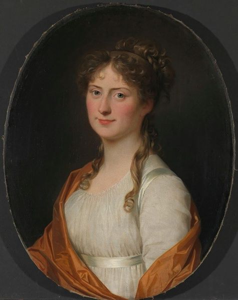 Editor: Here we have Barbara Krafft's "Portrait Einer Freifrau Von Richthofen" from 1822, rendered in oil paint. The portrait has an intriguing, almost restrained feel. I’m curious about what’s going on beyond the surface. What compositional or stylistic choices strike you the most? Curator: I’m drawn to the contrasting textures. The smoothness of the Freifrau’s face juxtaposed against the tight curls of her hair, or the stark red of the belt with her delicate white dress. Editor: That contrast in texture gives a really distinct quality. The choice of fabric for the dress too, with the polka dots. Is that meant to give a sense of her personality, maybe? Curator: It could. Observe how the artist creates visual tension, even through the subdued colour palette. It hints to what the Romantic style attempts to achieve—how would you interpret this stylistic alignment within this specific portrait? Editor: Interesting. So it’s more about the structure contributing to a mood than literally representing her. It definitely avoids idealized beauty for a more raw presentation, despite it being a high society portrait. Curator: Precisely. By emphasizing the visual structure of the composition – form and texture and color – Krafft achieves a compelling psychological snapshot. This challenges conventions of portraiture which usually present subjects in idealized states. It also is clear the artist decided to forgo symbolism to provide the viewer with a stark glimpse into the zeitgeist of her subject. Editor: I’m walking away thinking more about how choices around form are so indicative of more than just what’s on the surface. Curator: Indeed, every detail from brushstroke to hue is part of the composition to emphasize what the painting wants to project—which we often consider secondary in a portrait such as this.