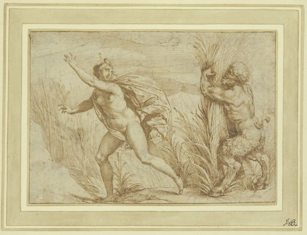 Editor: This is "Zwei Engel, die ein Kreuz halten" by Francesco Albani, a pen drawing currently held at the Städel Museum. The red chalk gives it a warmth, but I'm curious about the material significance, beyond the aesthetic. What's important about Albani choosing this medium? Curator: Well, consider the economic conditions surrounding Albani. The choice of pen and ink wasn't merely stylistic. These were relatively accessible materials, compared to the oil paints and canvas required for larger, more prestigious commissions. Does this accessibility impact who got to create and who was shut out? Editor: So, the medium dictated not only the art’s appearance but also potentially who could even participate in making art. Curator: Precisely. Also, think about the production of paper itself during Albani's time. Paper wasn't a universal commodity. Where did this paper come from? Was it locally sourced, reflecting a particular regional industry, or imported? We also need to question the symbolism. Angels holding a cross. This has connections to death, religious ritual. Who commissioned the work, and for what purpose? Is it study material or something meant to be publically available? Editor: It's almost like we are investigating the material conditions surrounding not only Albani himself, but even earlier periods. I see it as a sort of archeology to learn the processes involved. Curator: The materiality extends beyond the artist’s hand, it implicates socio-economic conditions that inform subject matter. Editor: I see the picture in a whole new economic context now. I will definitely remember to ask these questions about process when I come across a new work.