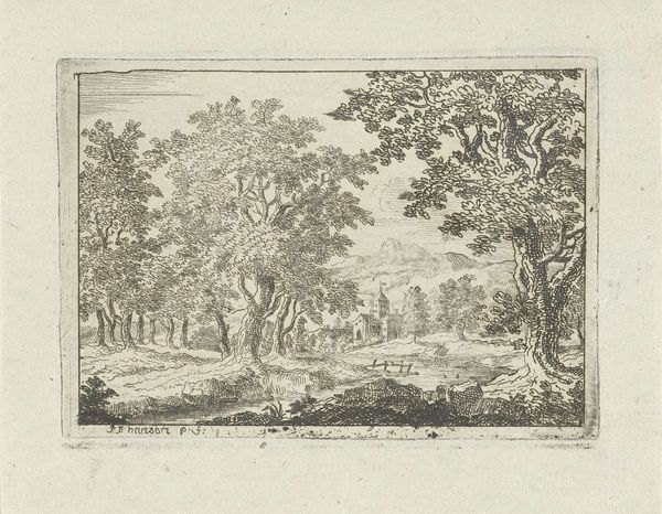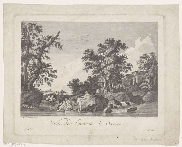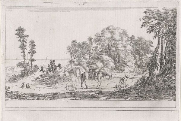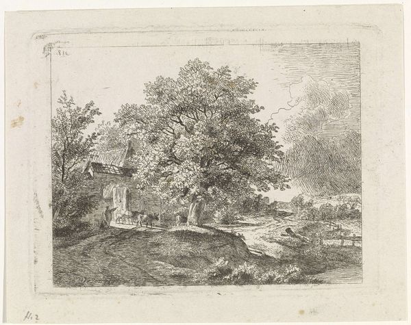 Reinierus Albertus Ludovicus baron van Isendoorn à Blois created "Reizigers in een landschap" using etching techniques in the 19th century. The Dutch Golden Age masters of landscape painting strongly influenced the artist, who came from an aristocratic background. The print depicts three figures journeying through a serene, wooded landscape. The concept of travel itself was imbued with social meaning; class determined the purpose and means of travel. Here, the travelers, likely on foot and burdened with belongings, represent the working class. A stark contrast to the leisure travels of the elite during this period. The vast landscape surrounding them symbolizes both opportunity and the potential precarity of their existence. Does the expansive scene evoke a sense of freedom, or a sense of isolation? While beautiful, the artwork poses questions about mobility, class, and the relationship between people and the land they traverse.