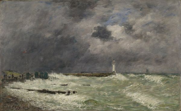 Editor: This is "Spanskesjøen" or "The Spanish Sea," an 1860 oil painting by Amaldus Nielsen. Looking at this choppy sea beneath a heavy sky, I feel a sense of melancholy, almost a premonition of a storm. What do you make of it? Curator: It plunges us straight into nature's raw embrace, doesn't it? There's this immediate, visceral quality – almost like being out there on the water, feeling the bite of the wind. Nielsen painted this *en plein air,* right there amidst the elements, so the immediacy you feel probably stems from the artist's physical response to the moment, rather than an attempt at classical romanticism. You can see how the impasto technique brings a thick materiality, that you can almost feel when the white foam rushes in from the painting. What if we compare the painting to a Wagnerian opera in visual form – all dramatic swells and ominous shadows? What do you think of the scene? What does it represent to you? Editor: Opera is a nice metaphor! The waves seem so powerful yet undirected; does the darkness always indicate menace? Maybe it’s just the end of the day, you know? Curator: Indeed, there's no singular story. The beauty lies in how Nielsen captured the universal sensation of standing before nature's might, with a touch of our own humanity. Does it remind you that even great, impressive elements of the world have both positive and negative characteristics to them? It's about acknowledging, perhaps, the tiny feeling that the ocean will do what it will, irrespective of humanity's tiny concerns. Editor: That's something to consider: to accept the natural world in its chaos and magnificence! This artwork captures the feeling of being both insignificant and entirely part of something enormous and beautiful, like a brief wave. Curator: Precisely, an ephemeral flicker within a grand spectacle! A wonderful insight, actually. Thanks for opening my eyes as well to new considerations around Nielsen.