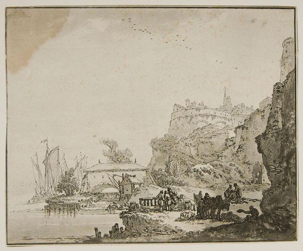 Curator: This is Salomon Gessner's "Schwanau," an etching capturing a Swiss lakescape. Its precise date is unknown, but it offers a window into the late 18th century. Editor: It feels melancholic, almost like a dream fading at the edges. The stark black lines against the aged paper evoke a sense of quiet solitude. Curator: Look closely at the marks, the artist is using an economy of line to suggest the textures of the mountainside, the density of the trees, and the ripples on the water. Editor: And what about the people? Are they fishing, or just taking in the view? Their labor is minimized, almost romanticized, don’t you think? Curator: Perhaps. Yet, Gessner was deeply inspired by the natural world, crafting idyllic scenes that reflected a yearning for simpler times, before industrialization really took hold. Editor: So, this isn't just about pretty scenery; it's about an imagined past, rendered through the very physical act of etching and printing. Curator: Precisely! Gessner invites us to reflect not only on the beauty of the landscape but also on our relationship to it. Editor: I see what you mean. It's more than just ink on paper; it's a whole world distilled into a single frame, inviting us to consider what's been lost and what remains.