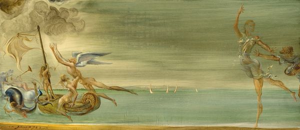 Curator: A somewhat bleak first impression; lots of jagged forms and murky brown tones. Editor: Today we're exploring "La chimère à l’île de Sarah Bernhardt," attributed to Georges Jules Victor Clairin. A canvas that seems to breathe myth and a haunting, untold narrative. Curator: Yes, that gloominess speaks to a specific symbolic vocabulary: angels, bare landscapes. It’s almost theatrical, in a gothic way. Is that a boat I see in the background? Editor: The landscape does feel desolate and the figures indistinct. This work seems deeply rooted in the Romantic era, a time obsessed with ruins, sublime nature, and melancholy. Considering Clairin's social circle, specifically his connection with Sarah Bernhardt, I find myself drawn to how such symbolic representations were perceived and consumed. Curator: Is this landscape literally constructed from ruins though? The textural qualities almost turn to ruin-as-object. In its use of oil paints and dark washes, do you see a direct conversation with the material processes reflecting that social unease you just mentioned? Editor: Precisely. Consider the raw materials— pigments derived from the earth, oil refined through industrial processes. These weren’t just aesthetic choices, but statements about the relationship between humans and our transforming environments. And look at the thick impasto in areas - a visceral handling of the medium that mimics the decay it depicts. Curator: That density then pulls our focus to these repeating jagged forms of destruction; the cultural memory embedded in our interaction with these spaces becomes undeniable. The symbolism of decay merges perfectly with how the work's actually composed through layers upon layers of tactile decay! Editor: By recognizing art’s connection to resources and labour, we unlock more meaning. This exploration moves past what it pictures, toward a vital discussion about society. Curator: Right! And looking at how Clairin weaves personal meaning, celebrity association, with broader mythical and symbolist themes enriches not only our appreciation, but prompts some broader questions, for example, how collective identity may find expression in artworks. Editor: This intersection provides deeper meaning beyond visual pleasure, leading to a better understanding of materiality shaping perspectives. Curator: A perfect illustration of visual and social commentary!