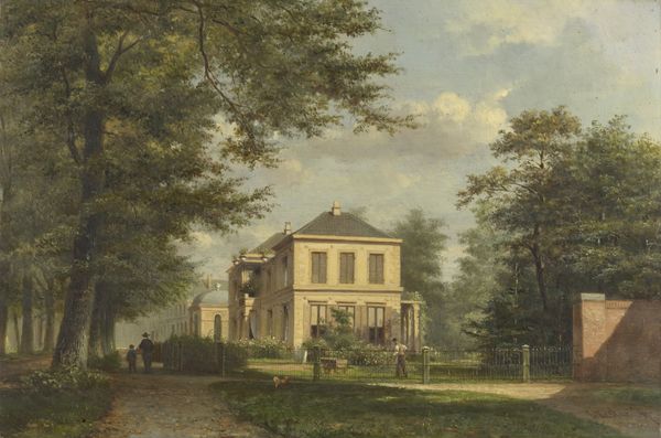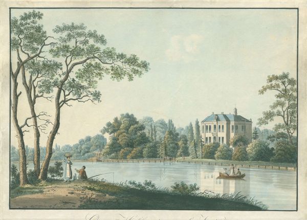 Curator: Looking at J.F. Clemens' "Sanderumgaard", made between 1748 and 1831, it is a quintessentially Romantic vision of landscape as both idyll and projection of social status. What is your immediate reaction? Editor: It evokes a sense of placid comfort. I notice first how the reflection on the water creates a sense of doubled, mirrored reality; how was this achieved? Curator: The work employs aquatint, so it is a print; this one has the added touch of color. The artist is documenting an estate, framing it through very controlled picturesque conventions. The family appears small, as though incidental, on their leisurely boating on the lake. How is labor reflected in this artwork, and how do you see social status? Editor: Yes, the leisure class at ease and removed from visible labor are certainly being presented. It begs the question, what kind of labor went into creating not just the artwork itself, but the idealized vision being presented? Who benefits? There are many possible relationships between land and labor embedded in that scene. Curator: It is worth mentioning, Clemens produced several landscape images; here, he’s playing into both the tradition of plein-air painting and a very deliberately curated construction of the landed gentry in Denmark. How would the local population have experienced this idealized view of the Sanderumgaard estate and the power structures inherent within? This piece and its perspective create both aesthetic pleasure and political distancing. Editor: Agreed; the estate itself would require upkeep by servants. Its very being depended on them and other lower members of the classes, not unlike how this art piece requires ink, paper, a press, et cetera, whose social contexts influence its very image. That being said, there's undeniable skill on display; the application of color, for example, creates depth that belies the two-dimensional surface. Curator: Absolutely, Clemens expertly employs light to evoke serenity, a key tenet of Romanticism. Editor: Understanding this art requires attention to the material realities as much as the theoretical ideals they present, reminding us how all forms of labor leave their trace, both visible and invisible. Curator: And interrogating the idyllic through a political and theoretical lens deepens our viewing experience.