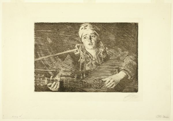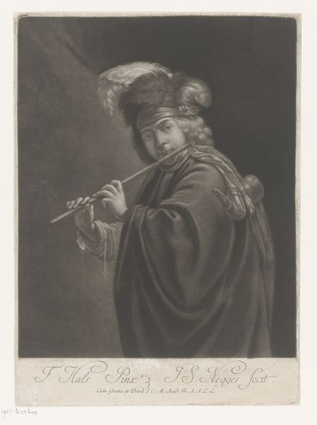 Curator: Ah, here we have Dirk Koedijck's "Vioolspeler" from around 1730. A baroque print made using intaglio, pen, and charcoal techniques, all brought together in a drawing. Editor: What strikes me immediately is the light! There's a sort of earnest quality to his expression, the way his face is illuminated. A flash of passion. Curator: Absolutely, Koedijck captures a youthful exuberance. These images served multiple roles, functioning as accessible art, available beyond elite circles thanks to printmaking’s capabilities. Editor: It’s like catching him mid-song, totally absorbed. Makes me wonder, what tune is he so lost in? I feel myself wanting to create lyrics. What do you make of that slightly askew hat and those feathery plumes? Curator: It hints at performance, doesn't it? Maybe this character, our violin player, wasn't just about skill, but about presentation, a public persona enhanced by those Baroque flourishes. Also it looks like a Caricature. Editor: That's very true. This wasn’t simply music, it was theater. Did these early performances cater to particular societal strata or perhaps political leanings? It is curious how something can be utterly of it's time but also have such enduring appeal, you know? I keep thinking that young man is playing just for me. Curator: The artist may have aimed to critique social performances, as portraits can affirm status or satirize it. That slight caricature element suggests maybe we’re not meant to take him too seriously, a common satirical take, lampooning certain performances, certain behaviors of that time. Editor: So, looking at this image I'm struck, as I said, by his captivating aura and, further, this gives us space to consider who holds power, who doesn't, what that even *means* - both now and back then. Thanks. Curator: Precisely, and it reminds us that art isn't simply decorative, it's a lens through which we can better understand and yes, critique social and political history. Thank you!