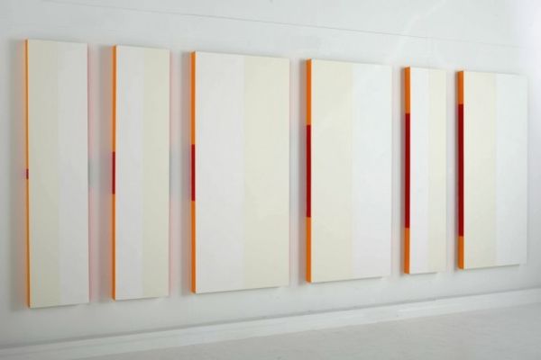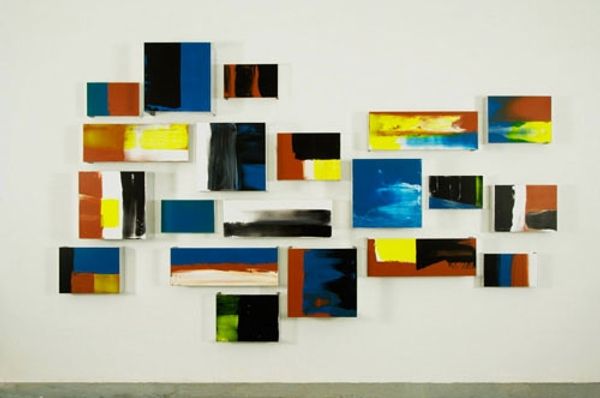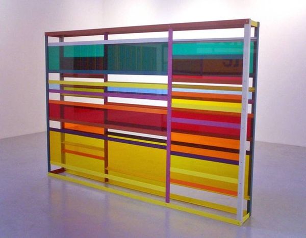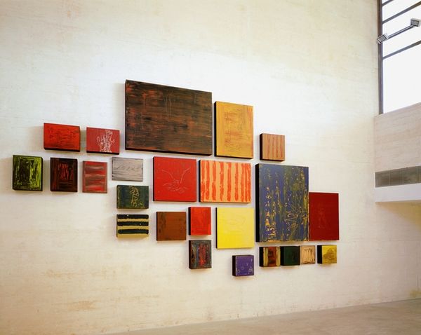 Editor: This is Sol LeWitt's "Wall Drawing No. 681 C" from 1993. It's a vibrant series of color ink washes applied to a wall divided into four squares. I'm struck by how the simple act of changing the direction of the lines completely alters the mood of each panel. What do you see in this piece? Curator: The bands remind me of threads or the warp and weft of woven fabric, drawing a line, as it were, through traditions of art, design, and craft. These colorful arrangements appear like flags of differing nations unified into a single composition by the black bands holding it all together. What feelings might be evoked through the symbol of a unified series of colorful flags? Editor: That's interesting. I was mainly thinking about the formal elements – color and composition – but your interpretation adds another layer. The flags could represent a sort of global harmony, or maybe the tension between individuality and unity. The diagonal lines especially feel like they're pulling outwards. Curator: Consider then how LeWitt, like Byzantine iconographers who prescribe specific images in prescribed forms, supplies the plan and the colours for each component but relies on draftsmen to actually produce the artwork on the wall. To what extent does his artistic authorship derive from conception versus execution? Editor: So it's like a set of instructions, a code almost, and each realization of the "Wall Drawing" is a unique interpretation of that code. Does that mean that, like flags, the wall drawing can carry distinct messages, based on the site, the community, and even the individuals realizing it? Curator: Precisely! The constant being the concept. As new contexts appear, new expressions of cultural memory and experience get painted onto the "canvas" of LeWitt's symbolic syntax. It reveals a network of ever-evolving symbolic potential that has continued across many eras. Editor: Wow, I'll never look at Minimalism the same way again. Seeing it connected to history and cultural identity… it really opens up the piece.