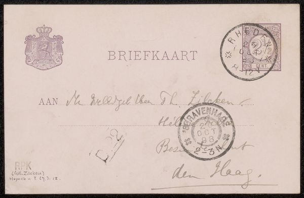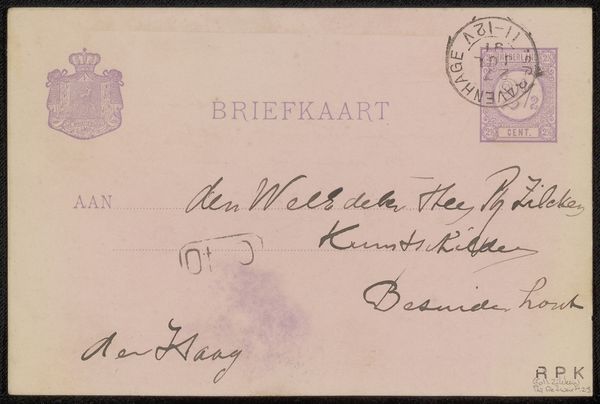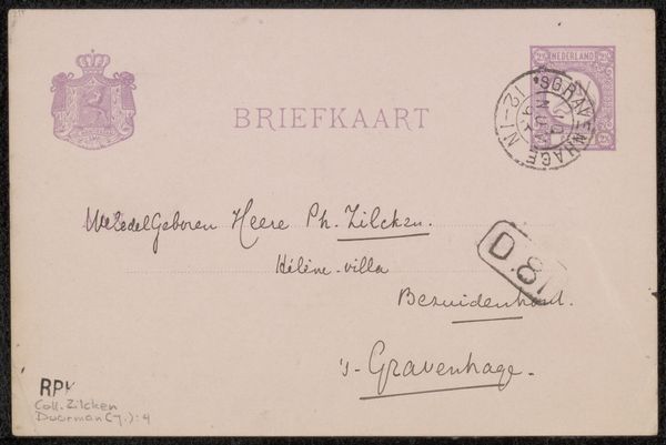 Willem de Zwart's Briefkaart aan Philip Zilcken presents us with a delicate interplay of text and pale colour on paper. The postcard's surface is divided into distinct zones of information – the heraldic crest, the printed address lines, the handwritten message, and the franking mark – each a formal element contributing to the whole. Note how the artist's script, looping and personal, contrasts with the rigid typography of the printed text, setting up a dialogue between the individual and the standardized. The pale hues, barely there, create a sense of faded intimacy, like a whispered confidence across time. Even the postal stamp, with its circular form and cancellation marks, functions as a miniature abstract composition. This ordinary piece of correspondence transcends its utilitarian function. It becomes an exploration of communication itself. It prompts us to consider how the formal qualities of something as simple as a postcard can carry layers of meaning, reflecting both personal expression and broader social structures.