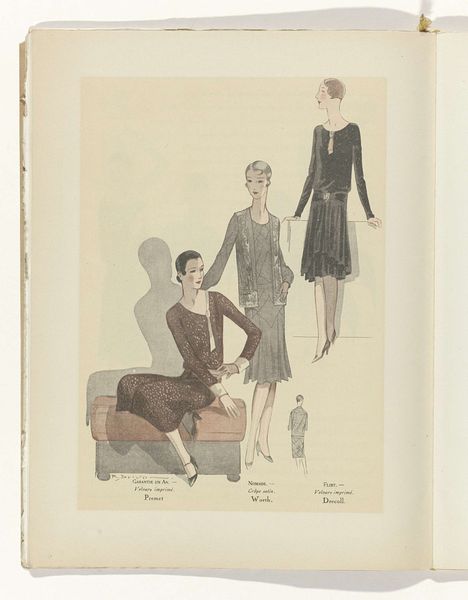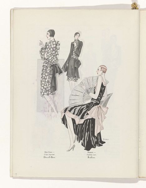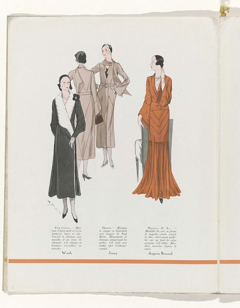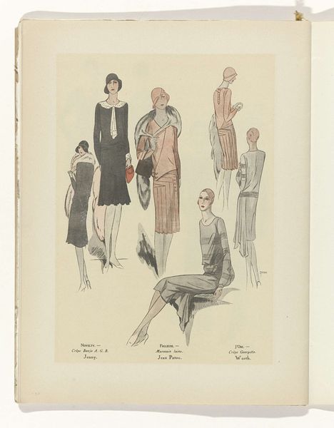 Editor: This is a piece entitled "Art - Goût - Beauté, Feuillets de l'élégance féminine" from May 1931 by R. Drivon. It appears to be a fashion illustration, made with ink and watercolor on paper. What strikes me is the emphasis on presenting archetypes. What do you make of it? Curator: The key word here is, indeed, “féminine.” Consider how the magazine format itself, and the fashion industry it promoted, helped shape new, evolving definitions of femininity in the early 20th century. The seemingly simple drawings participated in circulating very specific, arguably restrictive, ideals. Editor: Restrictive how? Curator: Look at the uniformity. These are all slim, tall figures with similar hairstyles. This ideal was relatively new and, arguably, excluded a vast majority of women at the time. What’s interesting is how "Art, Goût, Beauté" participates in setting standards for feminine elegance, but it is not clear whether it empowers women, or puts pressure on them to attain these looks. Editor: That's interesting. It is less about capturing unique beauty and more about enforcing certain fashion rules of the time, right? The magazine itself acts as a gatekeeper. Curator: Precisely. Who decides what "taste" and "beauty" are, and who benefits from those decisions? These are critical questions to ask ourselves. How do these images reflect broader socio-economic trends of the 1930s, for example? Editor: I hadn’t thought of it that way. I was initially just focusing on the aesthetic. Curator: Seeing beyond the surface is crucial. By understanding the social and historical context of these kinds of artworks, we start seeing that they tell us stories of who wielded power in culture, and who didn't. Editor: I learned that even seemingly innocent fashion illustrations played a part in broader cultural dynamics and can inform the understanding of socio-historical narratives. Curator: And also helps you understand your own aesthetic and cultural judgements, doesn’t it?