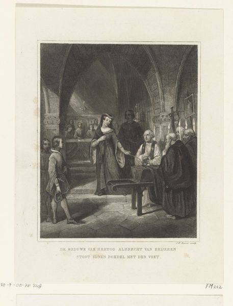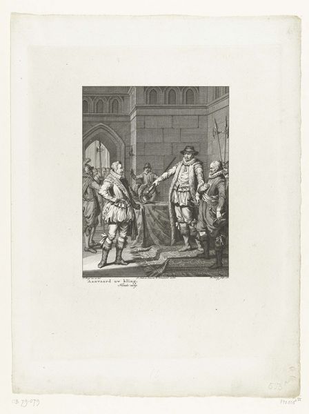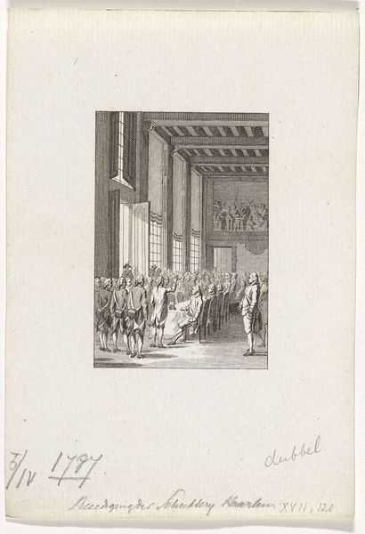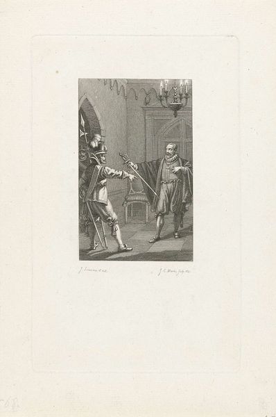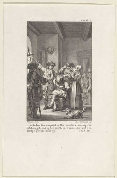 Curator: This stark scene before us is an etching and engraving titled "Man wordt door soldaten van zijn bed gelicht," or "Man dragged from his bed by soldiers" by Reinier Vinkeles, created around 1790. Editor: The drama leaps out immediately. The harsh light from the torches, the bed curtains, the very act… it speaks of vulnerability violated. Curator: The high contrast of light and shadow is characteristic of the Neoclassical movement, lending an air of moral weightiness to the event. This engraving reflects a particular trend in narrative art from this period. Editor: The symbolic content is inescapable: we have the citizen rudely awakened from his slumber, dragged, really, into the harsh light of… what exactly? What’s the implied meaning behind this abrupt intrusion? Curator: These 'genre' scenes of everyday life also carry potent socio-political weight. It was produced at a time of revolution, globally. One reading may suggest the disruption of domestic life by the heavy hand of the state. There are strong lines, almost brutal ones, that speak to this. Editor: Exactly, but in what sense? Are these soldiers upholding justice or enacting tyranny? Their faces remain obscured. Is this perhaps an allegory about state power, or the power of figures hiding under anonymity? The lantern looming overhead also strikes me: justice watching perhaps? Curator: Possibly both, given the era. This speaks to the way museums and cultural institutions have power in framing what gets created and how these ideas get perpetuated. Notice how Vinkeles’s use of line in the shading intensifies the feeling of chaos, highlighting this power play. The viewer is forced to consider who holds it, and to what end. Editor: Yes, an ambiguity that mirrors real-world anxieties then and now. Looking again at how those light sources draw the eye - it almost transforms into a psychological study of power relations and their consequences on a personal scale. Curator: I think you've touched on the essence of what Vinkeles was exploring: this artwork serves as a reminder that even domestic spaces can be battlegrounds for larger societal conflicts. Editor: Precisely. What appears as a simple etching is, in truth, a deeply layered reflection on political violence and resistance.