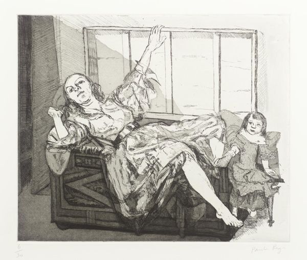 Editor: This is "El Sofá," or "The Sofa," a 1987 drawing by Enrique Grau. There's a dreamy, almost languid feeling to it, the woman reclining looks almost lost in thought. What strikes you about it? Curator: It's a visual poem laden with cultural symbols, isn't it? The lilies, for example, clutched almost protectively, often represent purity or resurrection, but their placement here... nestled against her, they take on a more personal, intimate meaning. Are they a gift? A self-offering? Editor: I hadn't considered the lilies that way! I was too focused on the overall scene. Curator: Grau masterfully orchestrates the scene to draw our attention to these symbols. Think of the ornate floral patterns of the sofa cover—they clash delightfully with the simpler design of her dress, creating a sense of layered identities, the public versus the private self perhaps? Editor: So you’re saying the contrast between the patterned sofa and her dress hints at a duality? Like she’s caught between different worlds? Curator: Precisely! And what of the coffeepot and carafe in the background? Echoes of domesticity, symbols of shared moments and intimate conversations, rendered in somber greyscale to subtly indicate that such conversations are now in the past. Editor: It’s amazing how much narrative is packed into one image. Now, I see layers of meaning. Curator: Grau's image is not just a representation of a woman on a sofa, but a tapestry woven from personal and cultural threads. These symbols create continuity and provoke curiosity about the cultural story woven by the image. Editor: It’s so much richer than I initially understood. Thanks for helping me look beyond the surface!