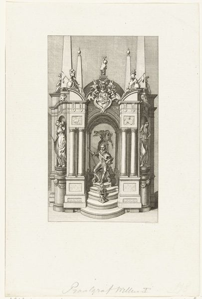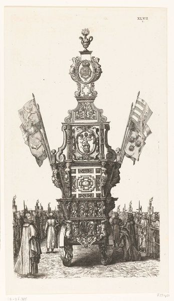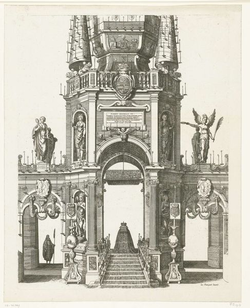 Jan Baptist Berterham created this print in 1702, it depicts a monument celebrating Philip V becoming Duke of Lorraine. The piece is a detailed engraving illustrating a multi-tiered structure adorned with flags, banners, and symbolic figures. Monuments like this were temporary installations that functioned as powerful displays of political theater. They were designed to impress upon the public the legitimacy and grandeur of a ruler, solidifying power through spectacle. Consider how the monument's design, with its classical architectural elements, was meant to evoke a sense of timeless authority and connect Philip V to a lineage of powerful rulers. There is also the overt display of flags and emblems. It’s a visual language of power, staking a claim to territory and identity, reminiscent of how nations use symbols to assert dominance. While the print memorializes a specific historical event, it also speaks to broader themes of power, identity, and representation. It prompts us to consider how such displays shape collective memory.