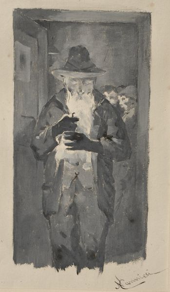 Curator: Nikolaos Gyzis created this pastel and charcoal drawing titled "The Glory of Psara" in 1898. The ghostly figure seems to be emerging from darkness into a pale light. Editor: There’s something really arresting about the materiality here—the rawness of the charcoal juxtaposed with delicate pastels. The layering gives it such texture, especially that light that appears like fabric. Curator: Gyzis created this work as part of a larger project commemorating the Greek War of Independence, particularly the destruction of Psara by the Ottomans. We need to see it as a deeply political and mournful work. Editor: Absolutely. The materials become part of the narrative, don’t they? The charcoal becomes the devastation, the smoky remains of what was. And that light—is it hope, remembrance, divine intervention? Curator: The figure itself is allegorical. I think the ethereal quality evokes collective memory, a spectral representation of Psara rising from the ashes of history, holding a writing tablet to remember and perhaps rewrite its history. The very act of remembrance, made tangible. Editor: It strikes me that Gyzis chose to foreground process and materiality so strikingly at this moment in the late 19th century. It seems to challenge conventional painting practices, almost collapsing "high art" with the supposed crudeness or banality of drawing. It suggests that labor—commemoration itself—is also part of the ‘glory.’ Curator: Indeed, looking through an intersectional lens, the act of remembering and retelling is a radical assertion of agency in the face of erasure. Who controls the narrative? Who is remembered? These are the crucial questions it raises. Editor: The drawing's texture becomes like palimpsest. Erasure and re-emergence as an ongoing and intensely laborious task. Curator: Reflecting on it, Gyzis reminds us that ‘glory’ isn’t a triumphant fanfare, but something forged in the crucible of suffering, remembered through communal effort, and always contested. Editor: And materially anchored. Labor, land, even ash. Thanks for offering such critical perspectives. It alters my perception greatly.