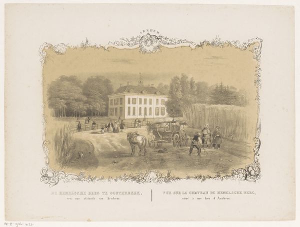 This print, "Gezicht op paviljoen Welgelegen," was made by Hendrik Wilhelmus Last in the 19th century, using a technique called lithography. Lithography is fascinating because it relies on the resistance between grease and water. The artist draws an image with a greasy crayon onto a flat stone or metal plate. This surface is then treated so that the image attracts ink, while the surrounding areas repel it. When printed, the ink transfers only from the drawn areas, creating the image. Looking closely, you can see the subtle tonal variations achieved through this process, giving the print a delicate, almost dreamlike quality. The detailed lines capture the architecture of the pavilion and the surrounding landscape, while the softness of the lithographic technique lends a gentle atmosphere to the scene. This print represents a moment in time, preserved through a process that combines artistry, craft, and a bit of chemistry. Appreciating the labor involved in this traditional printmaking method allows us to understand its historical and cultural value, and enriches our engagement with the image itself.