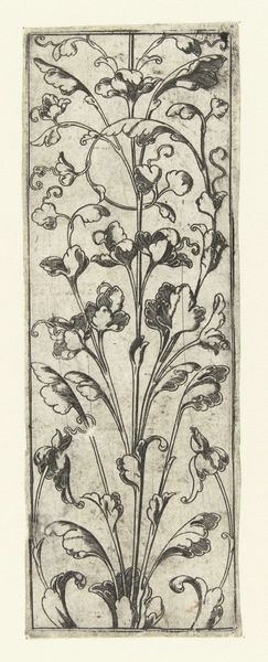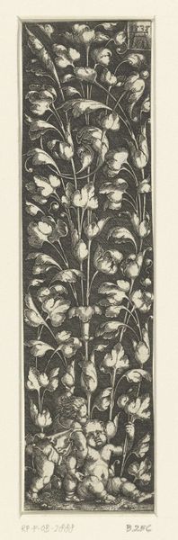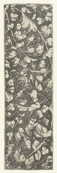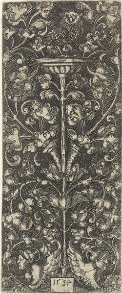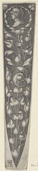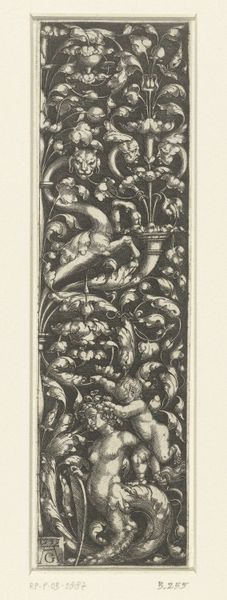 Curator: Welcome. We're looking at "Ornament met personificatie van de Gerechtigheid," an engraving made in 1538 by the German artist Monogrammist AS. It portrays an allegorical figure of Justice intertwined with intricate floral ornamentation. Editor: Wow, it's so dense! All those leaves and flowers—it feels like peering into a secret garden where even justice has to fight its way through the undergrowth. There's a feeling of confinement. Curator: Well, engravings like these weren’t always meant for grand display. They were often produced as model books for artisans. Jewelers, goldsmiths... they'd use these images as inspiration for their own work. Consider how readily such designs could be adapted to jewelry. Editor: So, like a sixteenth-century Pinterest? I love the idea of someone rocking a serious Justice-themed pendant back then. But does this tight composition, this sense of things pressing in, tell us something about justice at the time? Was it seen as restricted, maybe? Curator: The presence of Justice, bearing her sword and scales, certainly spoke to the importance of law and order within society. Justice was perceived as a virtue, necessary for maintaining social equilibrium. We need to be careful in reading too much negativity into this print; we should look for something that serves an overtly practical purpose. Editor: True. But still, that sword is quite prominent. The detail and those meticulous lines – the artist's certainly telling a story. To me the detail of her intense gaze, together with her stern demeanor, gives this allegorical image some serious weight. And, of course, everything framed by that dense foliage makes the figure look more imposing. Curator: You're right, this image might also have served to remind the viewer of justice's ever-present power. It reflects Renaissance ideals by intertwining classical allegories with meticulous ornament. Editor: Okay, now I see the dual purpose - ornamentation and heavy morality lesson - a sixteenth-century multitasking masterpiece. Curator: Exactly! The function of an image is a powerful thing. Editor: And now that you've pointed that out, it's much more engaging! Thanks!