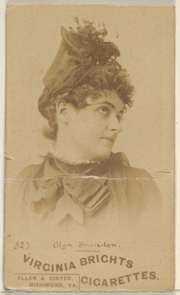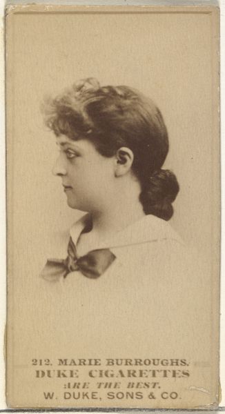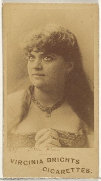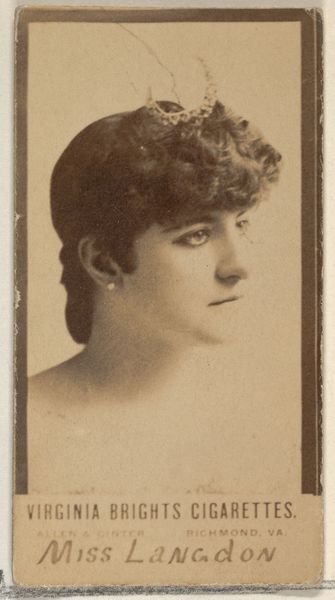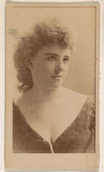 This is a cigarette card of Marie Jansen, from the Actors and Actresses series made by Allen & Ginter. Marie Jansen gazes to her right with a look of tranquil pensiveness. This pose, with the subject's face turned slightly away, has a long lineage, echoing classical representations of muses or goddesses in antiquity. We see this pose frequently in Renaissance portraiture, conveying both beauty and intellectual depth. Consider Botticelli’s Venus, the turn of her head reminiscent in its delicate grace. Over time, this subtle shift in gaze evolved, becoming a conventional symbol of feminine allure, often used to draw the viewer in. This image is a palimpsest of cultural memory, showing us how certain gestures and poses are subconsciously re-enacted across centuries and through different media. The turn of her head is more than just a pose, it is a window into how we perceive and remember beauty.