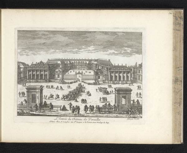 This is Poul Isac Grønvold’s "Domkirkepladsen i Roskilde," an etching rendered with delicate lines on paper. The composition, predominantly monochrome, arranges architectural forms and human figures across a public square. The visual structure is meticulously organized, dividing the space into distinct zones through perspective and scale. Grønvold's strategic use of line and form here may reflect the Enlightenment's emphasis on order and reason. The etching employs linear perspective to create depth, drawing the eye from the foreground figures towards the background buildings. The sharp, precise lines articulate details of architecture and dress, but also suggest a social hierarchy. Consider the formal arrangement of the architecture in relation to the human figures. The cathedral and adjacent buildings loom, dwarfing the procession of people. This contrast in scale may speak to the power structures inherent in 18th-century society. Such a dynamic encourages us to interpret the scene not merely as a depiction of a place, but as a carefully constructed representation of power, space, and social order.