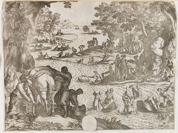 Curator: This is Nicolò Boldrini's "Hercules and the Nemean Lion," a striking print now residing at the Harvard Art Museums. Editor: It feels so immediate, violent even, despite the relatively small scale. The tension between man and beast is palpable. Curator: Absolutely. The story of Hercules strangling the Nemean Lion is one of triumph over seemingly insurmountable odds. The lion's invulnerable hide, a symbol of untamed nature, is subdued by Hercules' raw strength. Editor: And the process – that dense network of etched lines. It speaks volumes about the labor involved, the sheer physical effort to create this image. This wasn't mass production; each print would have been a painstaking endeavor. Curator: The image taps into deeper cultural narratives, the archetypal hero's journey, the conquering of chaos. It's a potent symbol of human potential. Editor: Seeing the work this way really highlights the human capacity to create meaning and value through a deliberate, material engagement. Curator: Indeed. It’s a reminder that even seemingly simple images can hold profound significance.