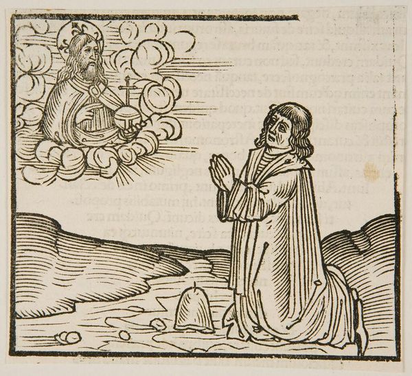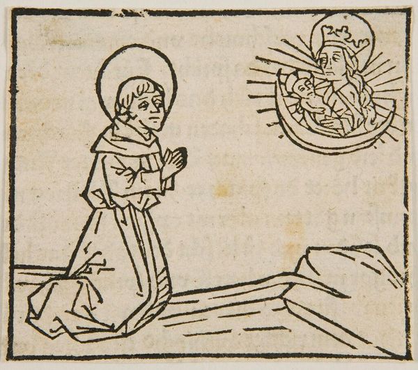 Editor: This is "Saint Donato", an anonymous work at the Harvard Art Museums. It looks like a woodcut. The stark black lines create a dramatic scene. What draws your eye in this piece? Curator: The composition is fascinating. The linear quality, the textures created by the hatched lines, and the stark contrast all contribute to a powerful image. The figure in the upper right, rendered with such bold lines, commands attention, wouldn't you agree? Editor: Yes, and it makes you wonder about the story behind it. I also noticed the varying line weights creating a play with depth, and the linear composition enhances the story. Curator: Exactly! The artist masterfully employs these formal elements to convey a narrative, even without color or shading. It’s a testament to the power of line and form. Editor: I see it differently now, focusing on the composition and form elevates the experience. Curator: Indeed, focusing on formal elements allows us to appreciate the artistic choices made by the artist, regardless of the narrative depicted.