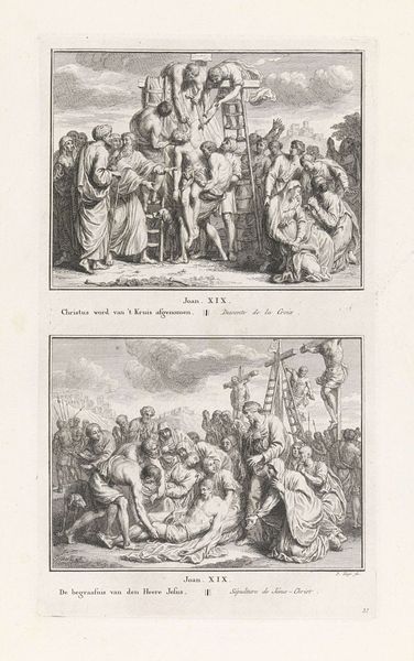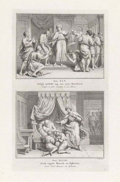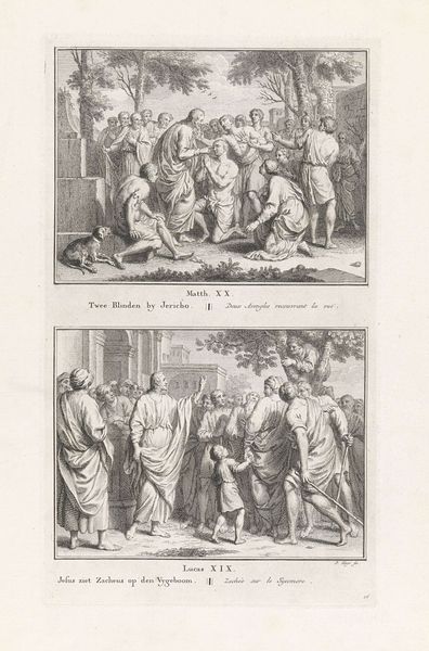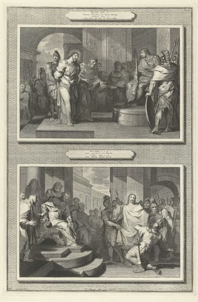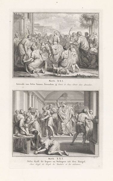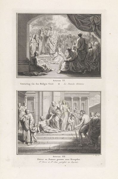 Curator: So, what leaps out at you from this etching by Pieter Tanjé, created sometime between 1716 and 1791? It’s titled "Presentation of Christ in the Temple/Simeon Blessing Christ," held here at the Rijksmuseum. Editor: Well, initially, the repetition. The two scenes stacked one atop the other. It feels like time collapsing, or maybe two facets of the same jewel reflecting different light. There's a stoic feeling to both, like watching history unfold, knowing what's to come. Curator: Exactly! The doubling emphasizes the importance of the event and its recognition. Tanjé has captured two moments described in the Gospel of Luke. Above, the presentation in the temple, and below, Simeon's blessing. Note the recurring figures and the architectural consistency. Editor: The repetition allows for a comparative symbolic reading. The presentation emphasizes duty and tradition - look at how deliberate the participants look! Simeon’s blessing below radiates with anticipation and fulfillment. I wonder if Tanjé was considering time’s arrow through those mirroring visuals. Curator: That’s astute. He certainly uses line work to create that sense of depth and procession, doesn't he? Each line seems intentionally placed, lending an air of classical grace. But at the same time, the rigid compositions evokes formality and ceremony and, let’s admit it, an unemotional distance. Editor: Yes, there's something so precise, so determined in the execution. Perhaps it speaks to a very baroque fascination with capturing pivotal moments with absolute clarity, freezing the narrative like an emblem, or an emotional state in permanent display. This clarity provides focus but perhaps with little room to let our own feelings join the journey! Curator: I agree! Its stoicism echoes an age striving to reconcile faith with reason, emotion with observation. Ultimately, this is a print meant to teach. Tanjé skillfully reminds us of this foundational Christian narrative through precise form, balanced design and duplicated important themes. Editor: It’s almost a double dose of revelation, an echoed blessing resonating across time! The very precision grants gravity. Tanjé lets that ancient story remind us how symbols are eternal; hope continues from every time to any. A very contemplative picture!