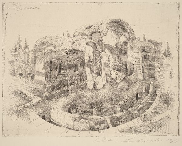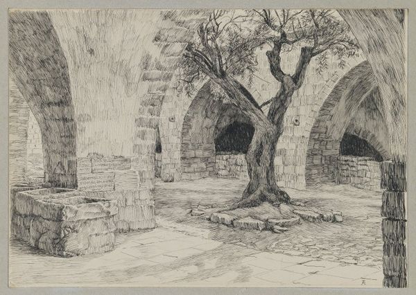 Pietro di Gottardo Gonzaga rendered this stage set design for a fortress or dungeon using pen and brown ink with gray wash. It's not a traditional artwork in the sense of high art, yet it reflects the skilled labor of draftsmanship involved in theatrical design. Gonzaga's skillful handling of pen and wash creates a palpable sense of depth and atmosphere, particularly with all the brickwork implied. The stone blocks are sketched with convincing realism, giving weight and solidity to the architectural forms. Each brick laid upon the other suggests the immense labor involved in constructing such a fortress, a process that speaks to both power and oppression. Notice the arches, the pillars, and the suggestion of endless corridors disappearing into the shadows. These not only create a sense of grandeur but also evoke the stark reality of confinement. Consider the chains prominently displayed in the foreground, stark reminders of captivity and control. Gonzaga transforms humble materials into a compelling vision of power, labor, and social control.