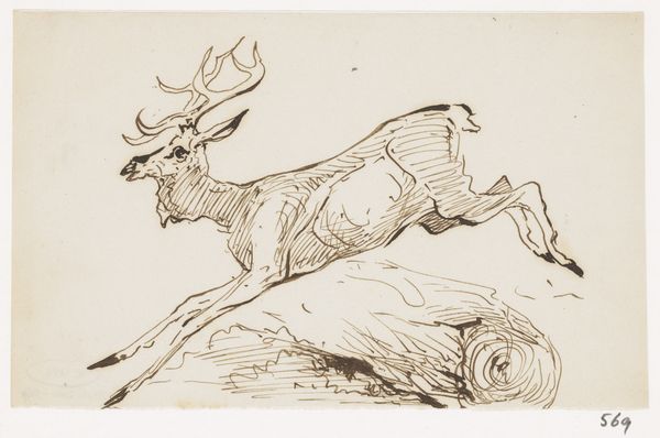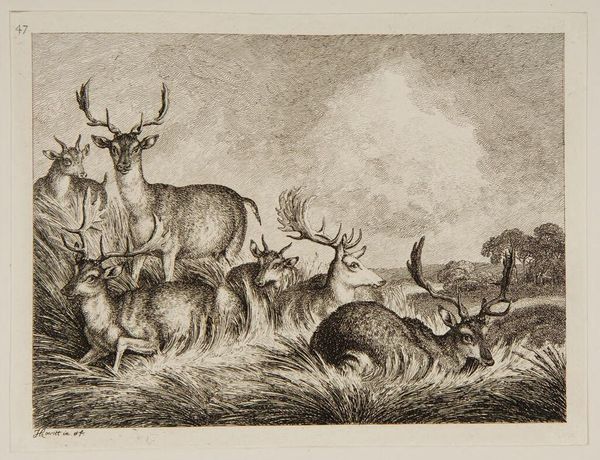 Curator: This is Samuel Howitt's, "Heads of Deer," a study of six deer heads rendered with fine detail. What do you make of it? Editor: There's a certain vulnerability to them, even the stag. Like they've been caught mid-thought, or perhaps mid-meal in one case. Curator: Observe Howitt’s use of hatching and cross-hatching; notice how it defines the forms, creating subtle gradations of light and shadow. The composition directs the eye in a circular pattern around the page. Editor: Right, and beyond technique, I'm drawn to the sensitivity, the artist's keen observation translating into something quite tender. Curator: Indeed, it's a compelling intersection of technical skill and quiet observation. Editor: Absolutely, a reminder that beauty often lies in the details and the artist's ability to reveal them.