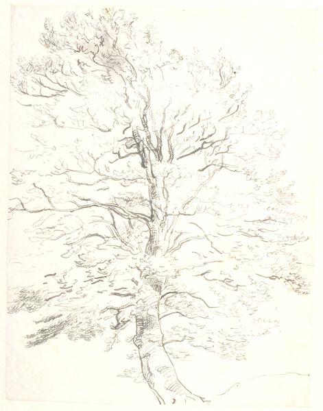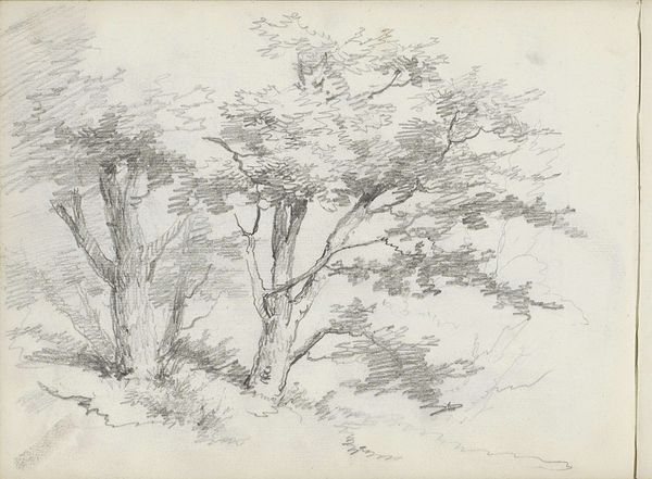 Editor: Here we have Jakob Maurer’s "Group of Trees," a pencil drawing on paper. There's a sort of starkness to it, almost melancholic in its monochrome simplicity. What do you see in this piece beyond the naturalistic representation? Curator: What strikes me is how this drawing, seemingly a simple study of trees, can be read through the lens of environmental consciousness. Consider the time this was created; the growing awareness of the human impact on nature, and the rise of landscape art as a response. Do you notice how the trees dominate the composition, almost pushing out any other elements? Editor: Yes, they feel very present, almost monumental. Curator: Exactly. It’s as if Maurer is emphasizing their importance, their presence in a world that was rapidly changing. Think about the political implications – land ownership, deforestation, and the rights of nature itself. How might this seemingly innocent drawing be a subtle commentary on those issues? Editor: That's a perspective I hadn't considered. The scale of the trees and the detail he includes does speak to an importance that goes beyond simply recording what he saw. Curator: Precisely. And if we view it through a contemporary lens, considering our current climate crisis, doesn’t it become even more potent? We're reminded of the fragility and the urgency surrounding our natural world. Editor: Definitely. It highlights how even seemingly simple artworks can have powerful connections to social and environmental issues. I will keep that in mind when looking at similar pieces.