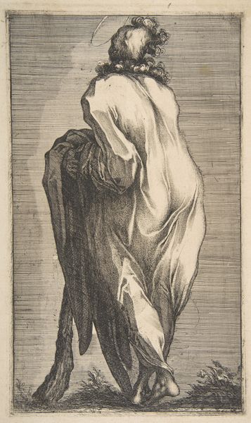 Jacques Bellange rendered this print of Saint Andrew with etching, sometime between 1595 and 1616. The composition is dominated by the figure of the saint, his form established through dense, parallel lines that create a striking play of light and shadow. The coarse lines articulate the textures of his robes and beard, evoking a tactile quality despite the print's two-dimensional nature. Bellange employs a sophisticated understanding of semiotics. He presents Saint Andrew as a figure marked by austerity and gravitas, whose unkempt appearance suggests a rejection of worldly vanity, embodying the spiritual values associated with his sainthood. Consider the cross at his feet. It serves not just as a symbol of martyrdom but as a structural element grounding the composition. The cross acts as a potent signifier, laden with religious and cultural meanings that would resonate with the contemporary viewer. The rough, almost brutal, etching style reinforces the themes of sacrifice. Ultimately, this print underscores the power of formal elements to convey complex narratives, reflecting the intricate interplay between artistic technique and cultural interpretation.