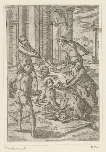 Editor: Here we have Antonio Tempesta’s engraving, "Foltering met scherpe punten en kokende olie," which dates from sometime between 1565 and 1630. The scene is, as you might guess from the title, incredibly violent and unsettling. What symbols jump out to you in this piece? Curator: It’s tempting to simply focus on the graphic violence, isn’t it? But violence itself is almost always symbolic. I'm drawn to the classical architecture in the background, framing the torture. Notice how the architectural forms almost mimic the human forms enacting violence – the archway, the pillars - rigid, unwavering, reflecting the perpetrators' resolve. Editor: I hadn’t considered that! The building feels so detached from the gruesome acts in the foreground. Curator: Exactly. The setting elevates what could be seen as mere brutality into a formalized, almost ritualized act. What do you make of the man pouring boiling oil, specifically the almost nonchalant expression he carries? Editor: He seems disconnected. Maybe Tempesta is showing how easily people can detach themselves from the consequences of their actions when they believe they're serving a higher purpose. Curator: Precisely. Think about how power, both religious and political, was visually reinforced during this period. The deliberate cruelty depicted isn't just about inflicting pain; it's about projecting power, erasing dissent through spectacles of suffering. The symbolism of fire, cleansing and destructive, is hard to ignore too. Editor: So, it’s a warning, perhaps? Curator: Perhaps a commentary on the psychological cost of unchecked power. Each element—the architecture, the act of torture, the detached expressions—contributes to a chilling symbol of dehumanization. Editor: I never thought about it that way. I came in seeing only the horror of torture. I'm leaving with a much deeper, and frankly, more disturbing, understanding of the work. Curator: It’s the power of images to transcend the immediate and speak to enduring anxieties. I appreciate your insightful reading of this difficult work.