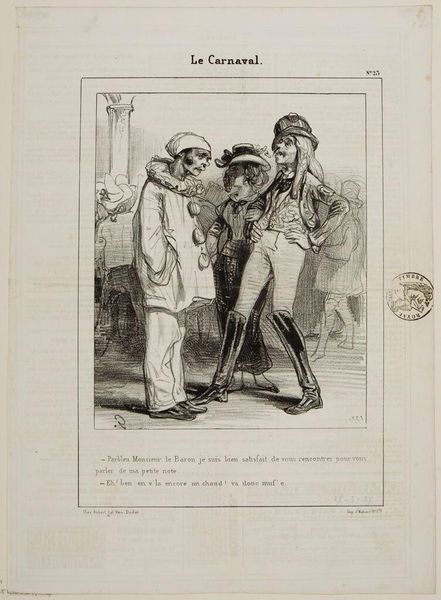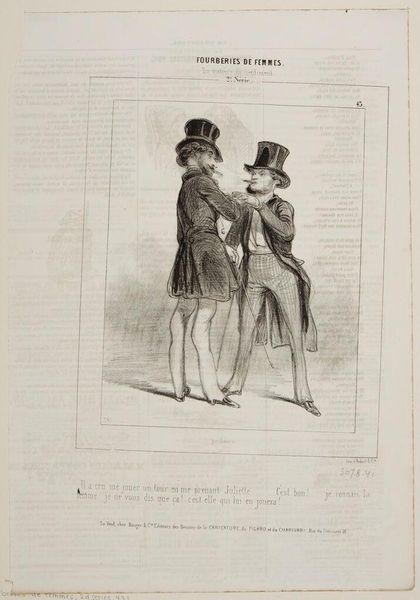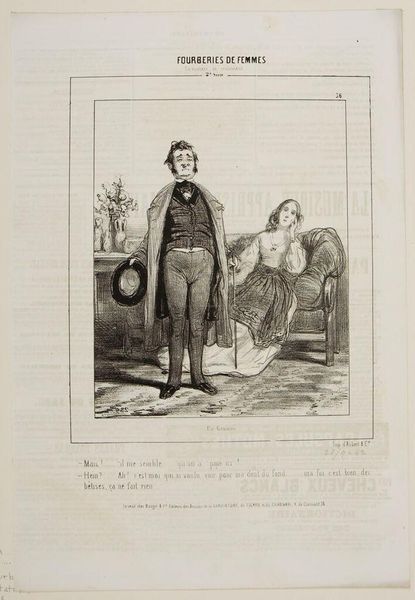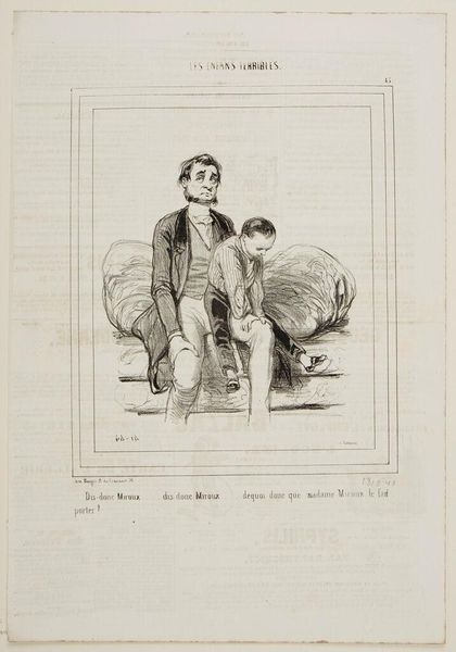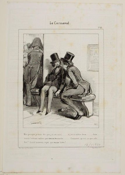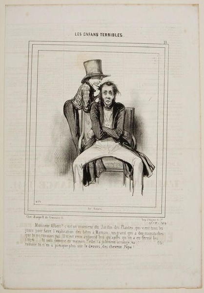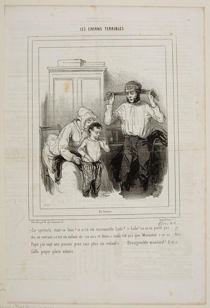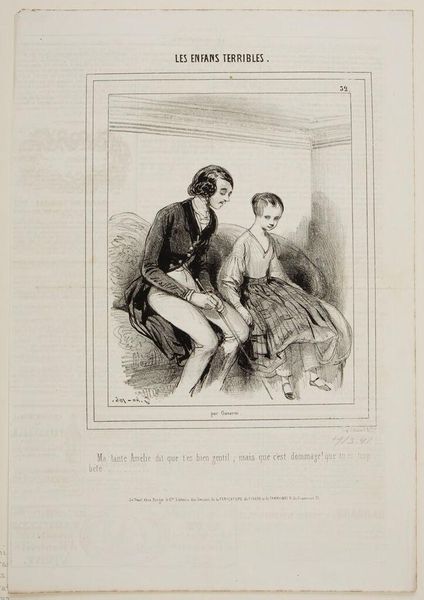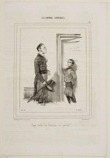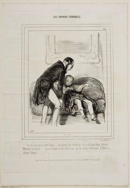 Curator: Gavarni's lithograph, "Mom isn't here because you returned before five o'clock . . .," captures a domestic scene, and the scratchy, quick lines lend a feeling of immediacy, don't you think? Editor: It's all about the printing process! Lithography allowed for these detailed, reproducible images, flooding the market and shaping social commentary in new ways. Curator: There's such tenderness in the father's stance, even if his words are a mild rebuke. It feels like he's trying to navigate the space between parent and friend. Editor: I'm more interested in the son's attire. The hat hints at a specific trade, a clue to the family's class and the labor he might be involved in. Curator: Maybe it’s the way light and shadow dance, but there's a whole narrative tucked into this small scene. Editor: Exactly, and mass production enabled a wider audience to interpret it.
