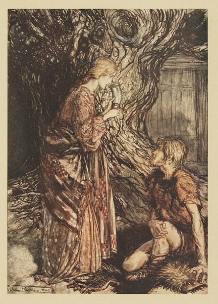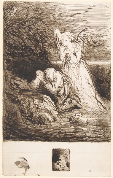 Editor: Here we have "The Dream of Lancelot (Study)" by Edward Burne-Jones, done in tempera, watercolor, and gouache. The color palette gives off a melancholy, dreamlike atmosphere. How do you interpret this work, considering its connection to Arthurian legend? Curator: The scene pulls us into the intricate web of desire, duty, and spiritual yearning that defined much of Pre-Raphaelite art. Burne-Jones often used Arthurian legends to explore the Victorian era's complex relationship with morality, gender, and the allure of the unattainable. Notice how Lancelot is passively positioned, almost vulnerable, and is being watched over by a golden angel figure. The composition makes one ask whether this symbolizes his inner turmoil or a societal judgment upon his illicit desires? Editor: I see what you mean. It does seem like a commentary on societal expectations and individual longing, especially within the constraints placed on women at the time, mirroring Guinevere's position in the love triangle. The legend definitely highlights their restricted agency. Curator: Precisely. These artists were keen on the use of symbolism that served to comment on power dynamics, both romantic and social. They actively promoted change while revisiting medieval and mythical themes in reaction to modern industrialization. How does the painting’s visual language support or subvert traditional narratives, especially considering the period’s social anxieties around gender roles and female sexuality? Editor: Now that you mention it, the subdued color palette seems to hint at hidden, forbidden love. Perhaps there is something feminist about portraying these vulnerabilities so openly, rather than painting over the reality of human nature. Curator: I would agree. And through art, there can be greater societal changes in seeing such open portrayals. Burne-Jones provides insight into suppressed realities within those gender roles, as you pointed out. Editor: That’s so helpful! It really reshapes my initial reading. Curator: Agreed.