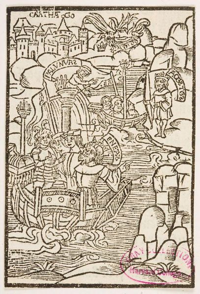 Curator: What strikes me immediately is the visual compression. It's chaotic, almost claustrophobic. Editor: This is a woodcut titled "Aeneas's Battles in Latium: King Latinus, Aeneas and Turnus," and it's located here at the Harvard Art Museums. We don't know who created it. Curator: The figures, identified as Aeneas and Turnus, are strangely doll-like, aren't they? The symbols of Laurentum looming in the background feel equally stylized. It evokes a fairy-tale quality despite the battle being depicted. Editor: It speaks to the popularization of classical stories. Woodcuts like these disseminated tales of heroism and conquest to a broader audience, shaping their understanding of history and empire. This would shape the collective imagination. Curator: The figures become stand-ins for universal themes: conflict, destiny, the clash of cultures. The simplified rendering amplifies these enduring motifs. Editor: Exactly, and that choice of visual style allows the story to resonate beyond its immediate context, echoing across time. Curator: Yes, and the way the anonymous artist chose to depict this is interesting given the epic scope of Aeneas' journey. Editor: Well, this was certainly an intriguing piece to contemplate together.