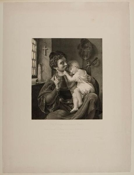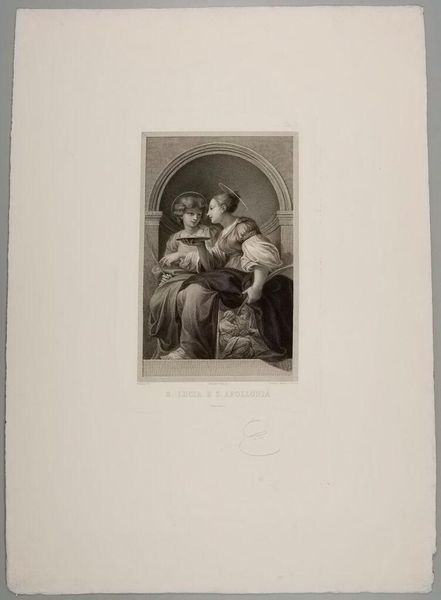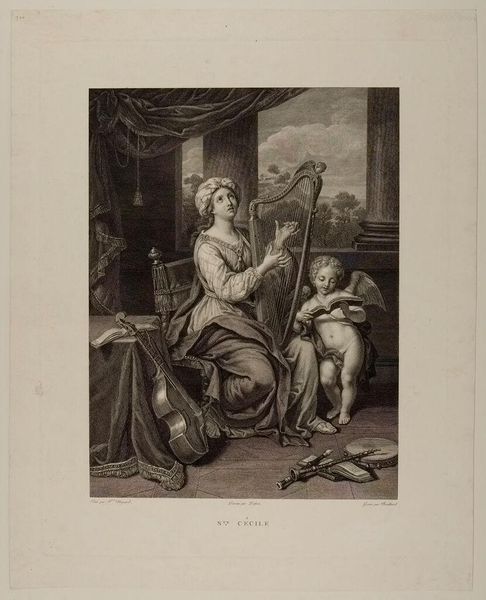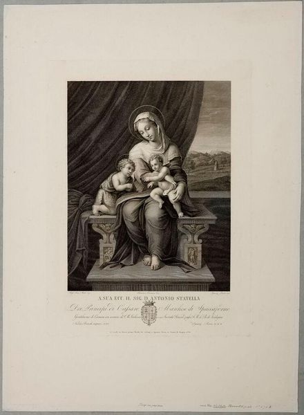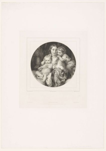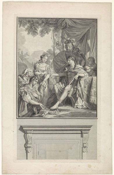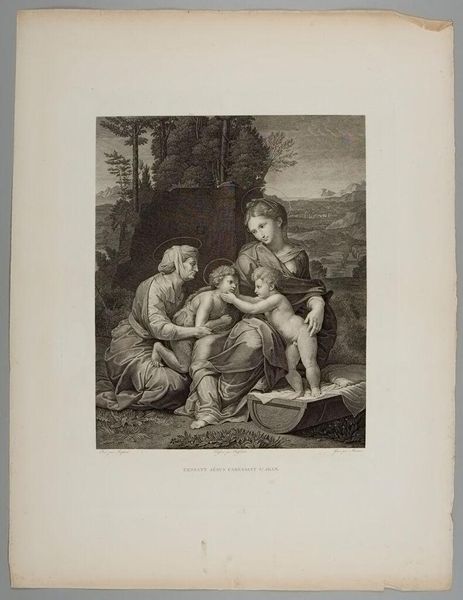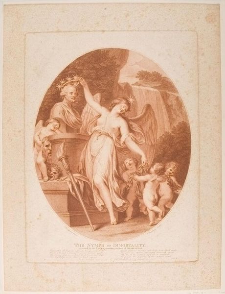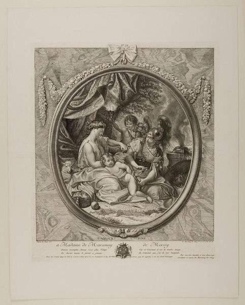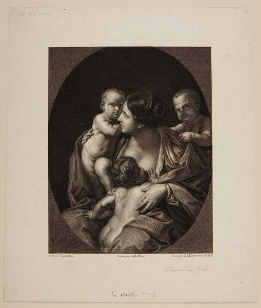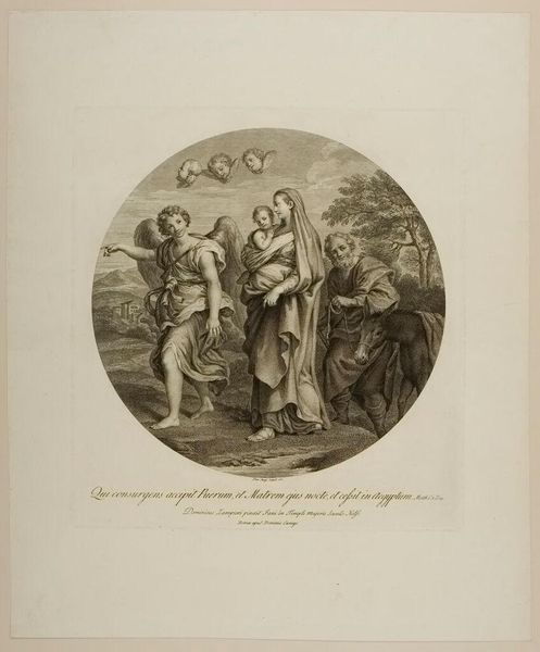 Curator: Domenico Cunego’s Birth of the Virgin presents us with a scene brimming with anticipation. The composition, contained within a tondo, creates an intimate space. Editor: Yes, the tonal gradations certainly lend a hushed, almost reverent mood. And water, an ancient symbol for purification and new beginnings, is prominent here. Curator: Observe how Cunego employs the circular format to emphasize the interconnectedness of figures, reinforcing the cyclical nature of life itself. Notice also the radial lines, emphasizing the focal point. Editor: Absolutely. And the figures surrounding the newborn are rich with meaning: The women attending, the water bearer—each speaks to Mary's blessed and protected status. The water jug feels timeless. Curator: The visual architecture, the stark contrasts of light and shadow, are meticulously crafted to draw the eye to the central figures. It is a masterclass in graphic rhetoric. Editor: It is a potent visual formula; Cunego merges art and devotion, creating a lasting image resonant with cultural memory. Curator: Indeed, and analyzing the interplay between form and content deepens our understanding of its enduring appeal. Editor: I agree. This piece provides a strong sense of visual continuity, an heirloom of cultural and personal significance.