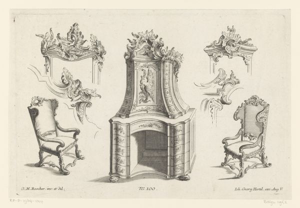 Editor: Here we have Jacques Juillet’s "Cartelklokken, trofee en gueridon," an engraving on paper from 1777. I find the precision in the linework quite striking; it almost feels like an architectural blueprint. What catches your eye in this piece? Curator: The enduring allure of Neoclassicism lies in its symbolic vocabulary. Notice how Juillet combines clocks, trophies, and a guéridon. Each element isn't just a household object; they embody Enlightenment ideals. Editor: Enlightenment ideals? Curator: Precisely. Consider the clock. More than telling time, it signifies reason, order, and the scientific measuring of the world. The trophies speak to civic virtue and achievement. The guéridon, or small table, suggests a space for intellectual discourse, the salon. Editor: So, the ensemble is making a statement? Curator: Absolutely. These aren’t just decorative objects, they're signifiers, loaded with cultural meaning. Juillet presents them together, proposing a vision of an enlightened domestic sphere, where artistry serves to uphold philosophical ideals. How do those swirling serpentine details strike you, placed in this context? Editor: I initially just thought they were pretty! But I suppose they represent something more than just decoration…perhaps an undercurrent of the older Rococo style even within this Neoclassical setting? Curator: An astute observation! These swirling flourishes hint at a continuity of style and perhaps a psychological reluctance to completely abandon the past, even when embracing a new vision for the future. Editor: I’ll certainly view these objects with a fresh understanding of their significance now! Thank you. Curator: Indeed, observing how everyday objects transform into symbols helps us appreciate the layers of meaning within a specific time and place.