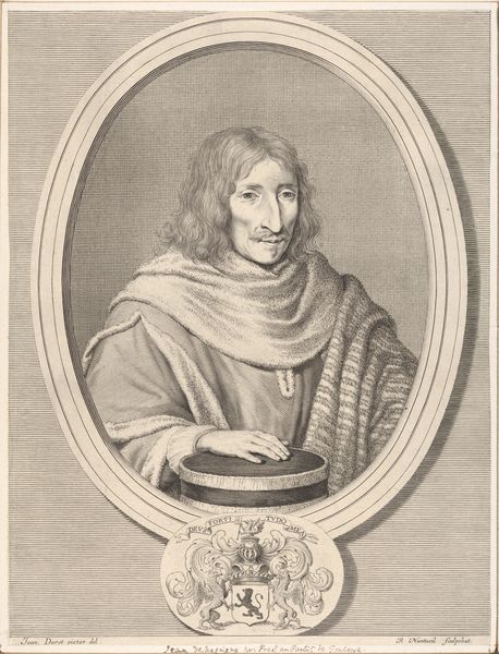 Curator: Robert Nanteuil's portrait of Jean de Mesgrigny presents a man of obvious stature. The somber tones create an atmosphere of quiet contemplation. Editor: It's interesting to consider this portrait within the context of 17th-century French aristocracy. His somewhat world-weary expression seems to speak to the burdens and expectations placed upon individuals of his rank. Curator: Precisely. The linear precision, the engraving technique, contributes to a sense of formality and control, yet there's a subtle vulnerability in his eyes. Editor: The detail in the rendering of his robes and the familial crest below, underscores his social position, highlighting the intersections of identity, class, and power. Curator: It's a testament to Nanteuil's skill in capturing the essence of his subject, both visually and psychologically. Editor: This portrait allows us to reflect on the role of the individual within the broader societal structures of the time.