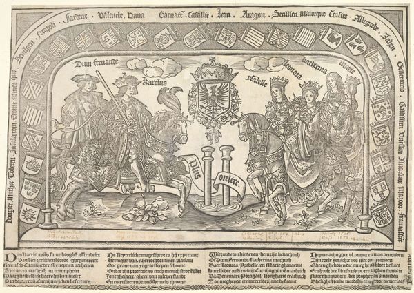This print, made by Antonio Tempesta around 1613, presents a dense, symmetrical composition dominated by the Medici coat of arms at its center. The heraldic emblem, crowned by two putti, is flanked by allegorical figures and intricate scrollwork, all rendered with meticulous detail. The visual structure is carefully balanced, creating a sense of formality and grandeur. Tempesta's use of line and shading constructs a complex interplay of light and shadow, adding depth to the composition. The elaborate ornamentation surrounding the Medici symbol reflects the cultural codes of power and patronage during the early 17th century. The print functions as a symbolic declaration, intertwining military prowess with divine favor. The allegorical figures suggest a connection between earthly power and celestial endorsement, legitimizing the Medici's rule. This piece challenges fixed meanings by engaging with new ways of thinking about power, representation, and the evolving socio-political landscape. The intricate craftsmanship and symbolic language not only serve an aesthetic purpose but also engage in a larger cultural and philosophical discourse.