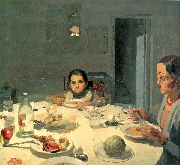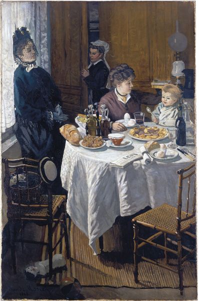 Claude Monet's painting, "The Dinner," now at the E.G. Bührle Foundation, captures a family meal shrouded in intimate shadows. The central symbol here is the communal meal, a motif that echoes through centuries, from the Last Supper to Dutch Golden Age banquets. In those, abundance signified prosperity, yet here, the scene feels muted, perhaps even strained. The hanging lamp casts a harsh light, reminiscent of Caravaggio’s dramatic tenebrism, underscoring the faces around the table. Consider how the act of sharing food has historically been a ritual of bonding, but here, it seems laden with unspoken tension. The shadows and indistinct faces hint at the psychological complexities beneath domestic harmony. This is not merely a snapshot of a meal, but an exploration of familial dynamics—an echo of primal human connections.