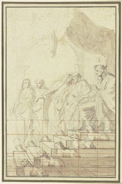 Eustache Le Sueur created this drawing, Christus bei Maria und Martha, using graphite on paper. You’ll notice a grid of lines throughout the work, a traditional method artists have used for centuries to transfer images and scale up their compositions. This practice provides insights into the labor and planning involved in creating larger artworks. The use of graphite, a readily available and relatively inexpensive material, suggests a practical, preparatory approach. Graphite, valued for its smoothness and ease of use, allows for detailed sketching and shading. It is particularly suited for underdrawings and studies like this one, as it can be easily erased or altered. The precision of the lines and the careful arrangement of the figures indicate a deliberate process, balancing artistic expression with methodical planning. Considering Le Sueur’s drawing through a lens of material and process helps us appreciate the blend of artistic skill and labor involved in its creation. It also challenges the traditional hierarchy between preparatory studies and finished artworks.