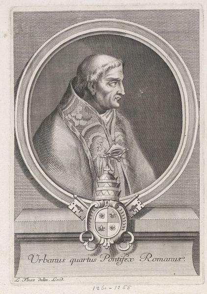 Editor: This engraving, dating back to sometime between 1620 and 1699, portrays Pope Clement VI. The artist is, sadly, unknown. It's fascinating how the engraver managed to convey so much detail with just lines. What strikes me most is how stern yet dignified he appears. What symbols or cultural memories does this image evoke for you? Curator: Indeed! The portrait immediately brings to mind the weight of papal authority. Note the careful inclusion of his papal arms below the portrait; the crossed keys of St. Peter, emblems of spiritual authority granted to the papacy. His gaze in profile, avoiding direct eye contact, subtly implies an omniscient, untouchable quality. Does his attire, in particular, trigger any thoughts? Editor: It makes me think about hierarchy, doesn't it? Every piece seems carefully selected to showcase his status. Is that the traditional garb for a Pope in that era? Curator: Precisely! And consider the rose-like ornaments on his robes – what emotions might those stylized elements convey to contemporary viewers compared with our own? How might the portrait communicate not only temporal authority, but divine right? Also, notice the oval frame: doesn't it suggest a contained world of power? Editor: I never thought about the frame itself carrying meaning. It almost isolates him, visually setting him apart. I’m now wondering what an audience from the 17th century might have thought about this portrayal, especially about its accuracy and power dynamics. Curator: Exactly! It shows how art can transcend its immediate subject, triggering memories of cultural and emotional legacies and hierarchies embedded in such seemingly simple lines. It makes you think about power beyond just the individual, doesn’t it? Editor: It definitely does. I see it as much more than just a portrait now. Thanks so much!