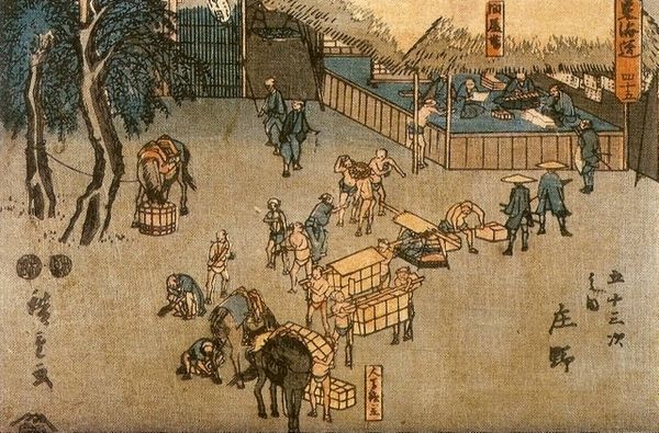 Curator: This is Utagawa Hiroshige's "Nihonbashi: Morning Scene," a woodblock print from his "Fifty-three Stations of the TÅkaidÅ Road" series. The work, an Åban print, is part of the collection at the Harvard Art Museums. Editor: It's striking how the artist uses perspective to draw the viewer's eye along the bridge, but the muted palette evokes such a somber mood. Curator: Notice the composition - the bridge bisects the print horizontally, with the bustling figures providing a dynamic interplay of forms. The muted palette, as you noted, does influence how we perceive the space. Editor: I think it speaks to the working class and the importance of the road. The woodblock print illustrates the labor of everyday life in Japan, as workers carried products to the market. Curator: Yes, but one can also consider the formal aspects: the artist's expert use of line to create depth and texture. Editor: Ultimately, the work gives a voice to laborers of Japan, which I find to be quite moving. Curator: Indeed, it also provides insights into the aesthetics of the time.