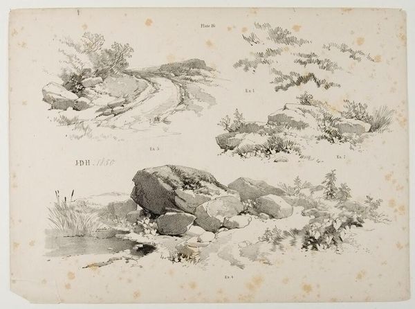 Editor: This landscape evokes a sense of quiet observation. The artist really captures light and shadow with such precision! Curator: Indeed. What we're seeing is plate 20 from James Duffield Harding's "Lessons on Trees." Harding, who lived from 1797 to 1863, created this study, focusing on the structural elements present in nature. Editor: The meticulous detailing reminds us of the labor inherent in both representing and shaping the natural world. The arrangement on the page is particularly striking. Curator: The artist is emphasizing visual instruction; here, Harding demonstrates how to construct a landscape using distinct forms. He's breaking down the scene into digestible parts for the viewer. Editor: It's as much a lesson in seeing, really, as it is in art-making. I am struck by the lack of any figures. It invites introspection. Curator: I agree. By isolating these natural elements, Harding invites us to contemplate not just the forms themselves, but our relationship to nature's building blocks.