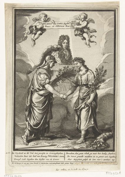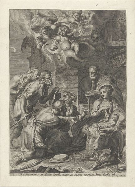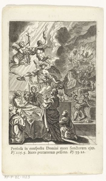 Editor: Here we have "The Annunciation," an engraving by Jacob Folkema, created sometime between 1702 and 1767. It depicts the Virgin Mary receiving the angel Gabriel, set within this very Baroque scene. It's striking how the scene, despite its ethereal nature, feels so… grounded, I guess? What’s your take on this work? Curator: It's fascinating to consider this engraving within the context of 18th-century printmaking. Notice the very clear linear work and stark contrasts produced by the engraving, giving it a more "everyday" visual accessible to the masses. How might the availability and cost of paper affect the scale and detail of the work? Editor: So you're saying the economic and material realities influenced the final form? Curator: Precisely. Engravings like this were often made as reproductions of paintings. Do you think the labor and cost involved in producing prints democratized access to art, or just commodified religious narratives? Were these prints used mainly for devotional purposes, or as fashionable decorations for homes? Editor: That's a really interesting point, especially considering the time it takes to create one of these engravings! Seeing it that way, it is a fascinating case study in the industrialization of art through reproducible print. Curator: Indeed. It highlights how even seemingly spiritual art is deeply embedded in the material conditions of its production and circulation. Editor: So much to think about... Thank you. That gives me a whole new angle on appreciating engravings of this period. Curator: And considering these production issues leads to many social issues tied to that time, opening an insightful angle into this beautiful work!