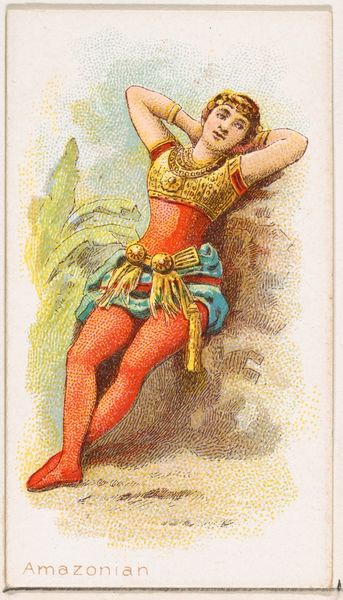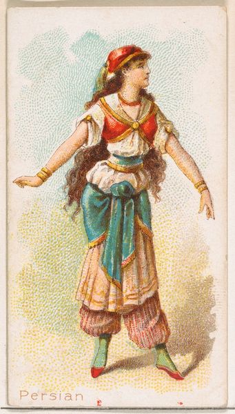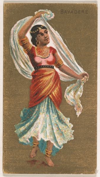 This small chromolithograph of an "Assyrian Dancer" from the "Dancing Women" series was produced by the Wm. S. Kimball & Co. The figure stands on what could be a stage, caught in a moment of stylized grace. Notice how the artist uses color and line to create depth and movement. The palette is soft, dominated by pastel shades of white, gold and green. The figure’s diaphanous gown drapes around her form, accentuating the contours of her body. The composition invites us to consider orientalist fantasies prevalent in 19th-century Western culture. The dancer's costume, with its exotic fabrics, evokes a world of opulence and mystery. The emphasis on ornamentation and display serves as a semiotic marker, signaling cultural difference and exoticism to a Western audience. This image thus negotiates the complex interplay between representation, identity, and cultural imagination. Finally, the function of this artwork is important. As a collectible card, it reflects how images circulated within consumer culture, shaping perceptions and desires through their aesthetic and ideological content.