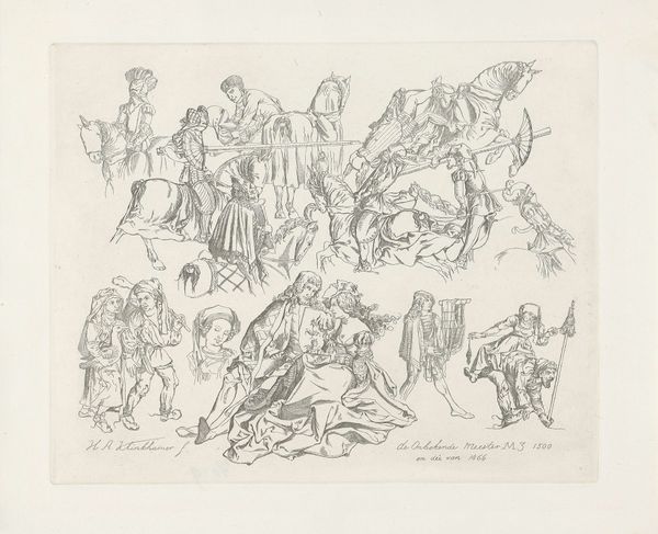 Editor: This graphite and pencil drawing is titled "Study for The Battle of Waterloo," created around 1824 by Jan Willem Pieneman. It's at the Rijksmuseum. It has such an ephemeral quality; like a fleeting memory of conflict. What's your interpretation of the work, seeing it within its historical context? Curator: Pieneman here participates in a European-wide effort to represent and memorialize the Napoleonic Wars. This sketch offers insight into the staging of such representations. We see, not a battle in media res, but an effort to understand how the heroic individual exists amidst the chaotic movements of war. The light tonality also participates in this agenda, making the conflict one event among many that make up "history." Do you notice how the chaotic scrum of bodies contrast with the lone figure on horseback, rearing up? Editor: I do, it's really striking! It seems to underscore a tension between individual glory and the brutal reality for the masses involved. How would this preparatory sketch have informed Pieneman's eventual painting, and who exactly was that painting designed to address? Curator: Excellent question. By accentuating specific parts of the composition, Pieneman could have highlighted certain political perspectives of the battlefield itself. Think about how memorialization is often as much about celebrating a nation as about mourning loss. And, for whom do these memorials serve? Who gets remembered? Who is forgotten, or actively erased? Editor: So, the figures chosen, the poses struck...it all becomes part of a political statement about national identity. Curator: Precisely. Now, how might a contemporary artist approach the same subject matter, given the changes in warfare and the social values regarding conflict? Editor: That's fascinating to consider; I guess what struck me initially as ethereal might actually be part of a conscious construction of history and the public memory. Thanks for the insightful perspectives. Curator: Likewise. Thinking about art's role in shaping public understanding always keeps it relevant and helps us look critically.