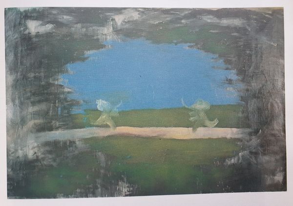 Curator: This oil painting is titled "Sloven," created in 1990 by Oleg Holosiy. Editor: Well, immediately I see a sense of haunting, almost a ghostly procession, with pale figures emerging from a darker ground. What do you make of it? Curator: What strikes me is how Holosiy applied the paint. You can clearly see the brushstrokes, the materiality of the oil on canvas. The artist almost builds up the figures using layers of paint, lending them that spectral quality. Editor: And those eyes! They appear in unexpected places, within what seems like the backdrop or hair, staring directly at the viewer. It creates a feeling of being watched, of being implicated in something unseen. Could they be symbols of inner turmoil or perhaps allusions to a hidden, spiritual dimension? Curator: That’s a valid point. However, I wonder about the context of 1990. What materials were available to Holosiy then? Were they limited in ways that dictated the techniques we're observing now? Restrictions of production might certainly influence aesthetic choices, I feel. Editor: Perhaps. Yet, the repetition of the figures, their blankness, to me, that reads as intentional symbolism. They become archetypes, emptied of individuality, embodying something more universal and unsettling. Curator: It’s interesting how you see them as archetypes, and I can also imagine the materiality of the painting and of art during this period acting as symbols too. Perhaps it also reflects on a certain material and spiritual climate of a country facing change? Editor: It certainly leaves you with a lot to ponder about its maker. What would be your ultimate insight here? Curator: I am most impacted by how art making decisions can often have something to do with economics or availability of resources. The means and modes of production, don't you agree? Editor: Certainly the availability of resources affects the artwork but how people engage with the symbolism, how the viewers relate to its iconography—that’s the most fascinating element for me here.