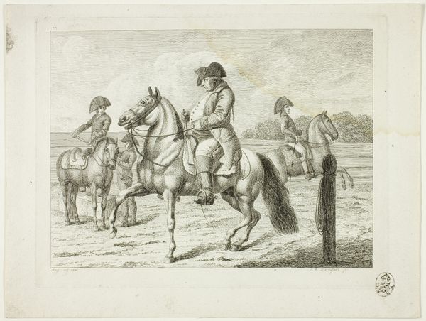 Editor: So, this drawing is titled "Cavalry Exercise in a Meadow," made by Constantin Guys. It's made with watercolor, ink, and colored pencil on paper. The drawing has a lot of movement, and the light feels very fleeting. How do you interpret the symbols in a seemingly simple scene like this one? Curator: For me, it evokes a sense of temporal unease. The soldiers on horseback—notice how Guys captures their postures. How do those postures speak to you? Do you find an interplay between individual action and collective identity, as manifested through their synchronized cavalry practice? Editor: Definitely, the uniform postures emphasize their military discipline, while each horse and rider also seems unique, like individual expression within the group. Curator: Exactly. Consider also the use of negative space. The light brushstrokes, the openness of the meadow against the detail of the figures. This resonates with the romantic ideal of military life balanced with nature, but the openness, for me, holds another tension. Does this resonate as preparation for some future conflict, or a nostalgic vision of tradition for you? Editor: Hmm, the exercise could suggest both anticipation and remembrance, now that you point that out. The cultural memory aspect makes sense to me. The landscape almost becomes a character itself. Curator: And how does the implied power dynamic shape your interpretation? Who do you see in control? Editor: That’s interesting... at first glance, the riders, but perhaps the landscape itself will endure long after they are gone. This piece makes you think about the fragility and impermanence of even seemingly powerful institutions. Curator: Precisely. It highlights the tension between fleeting individual power and nature's enduring presence, all intertwined with our cultural memories and longings. I always learn something new when contemplating Guys’ sketches. Editor: Me too. I’ll definitely think differently about cavalry images after this!