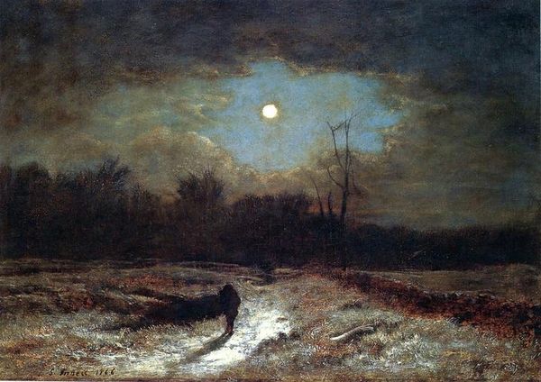 Curator: Isaac Levitan’s “Boulevard in the Evening,” painted in 1883, invites us into a snow-covered cityscape now held at the National Gallery of Armenia. Editor: Immediately, I'm struck by its subdued palette, that dominating dark tonality really evokes a strong sense of stillness, perhaps even melancholy. Curator: Levitan employs oil paint here in a way that almost anticipates the broken brushwork and optical mixing that became central to Impressionism, which really reflects its period and also adds to the overall somber mood. Think about how this application informs the experience of urban life. Editor: Precisely! The silhouetted figures evoke a timeless sense of loneliness, I wonder how much those isolated figures are meant to mirror or oppose each other across the boulevard? It's clearly figuration embedded in an overtly romanticist scene. The streetlights scattered along the boulevard become these symbolic beacons amidst the dark snow, they offer some type of elusive directionality for the obscured human forms. Curator: Right. He is not focused on the documentation of social interactions, or class identity as such. It really calls into question that relationship between art, urban labor, and everyday practices which seem to disappear with his broad treatment of the forms. Instead, we are given a certain mood evoked by a series of material arrangements that point to line and direction, almost diagrammatic in their execution, yet romantic at the same time. Editor: Definitely. And the very sparseness of detail pushes those emotional overtones into the fore. The way the trees reach upwards, the indistinctness of those figures… it all contributes to a visual language steeped in memory and emotional experience. We might remember from other painters of this time frame those who romanticize rural idyll, and it may not seem apparent in this canvas, but there seems to be a similar type of emotional expressionism operating on this winter night in an urban center. Curator: It's curious to consider that even now, almost a century and a half later, those material applications of paint – and those bare branches in particular – resonate and recall that visual language you are referring to in a way that defies a fixed timeframe of understanding or influence. Editor: I find myself lingering over those glowing dots that could be seen as lamplight in that stark darkness, each a spark of memory in that stark landscape. Curator: Absolutely. Examining this boulevard under a material lens alongside its symbolic weight reveals the way social elements have come to leave a lasting trace in cultural imagination and pictorial technique.